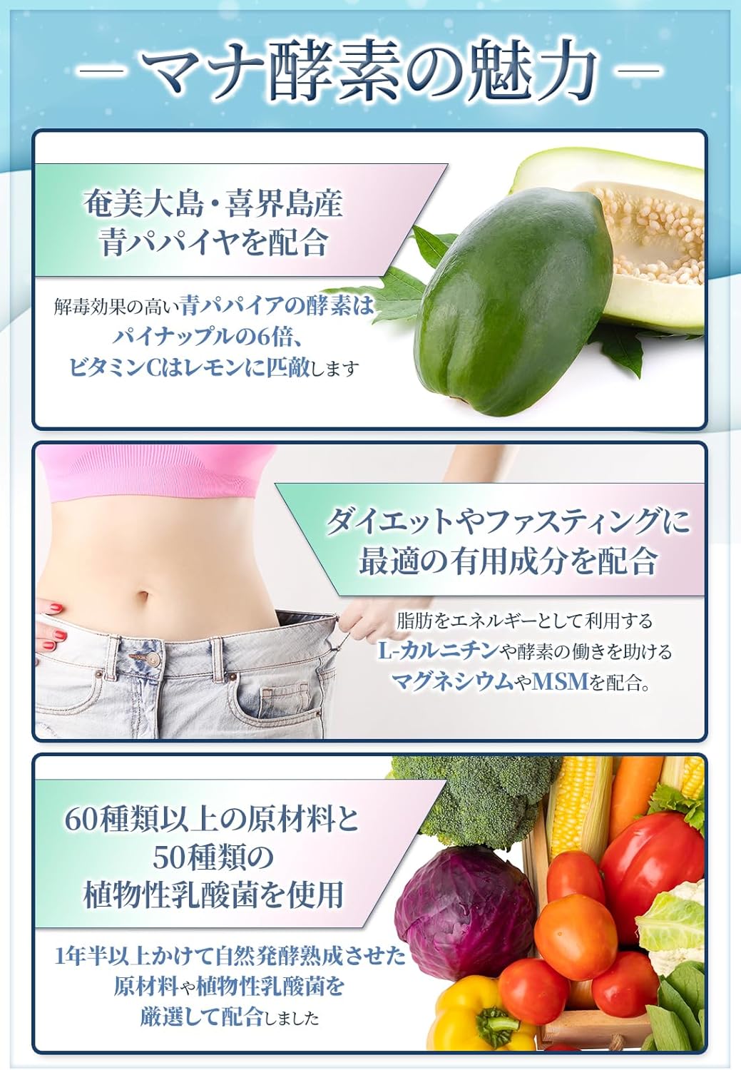 こだわりぬいた素材や成分 無農薬・無添加だけがマナ酵素の良さではありません。 原材料60種類以上、植物性乳酸菌酵母菌50種類以上を配合し、その全てが国産です。 ファスティング期間には嬉しいマグネシウム・カルニチン・MSMなど有用成分を豊富に含んでいます。