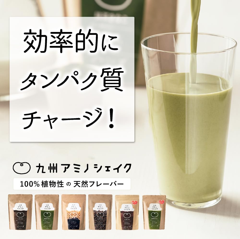 「九州アミノシェイク」は、100%植物性の、美容と健康にやさしいプロテイン。ナチュラルな甘さと風味が魅力です。お気に入りのフレーバーを見つけて、健康的にたんぱく質をチャージ♪