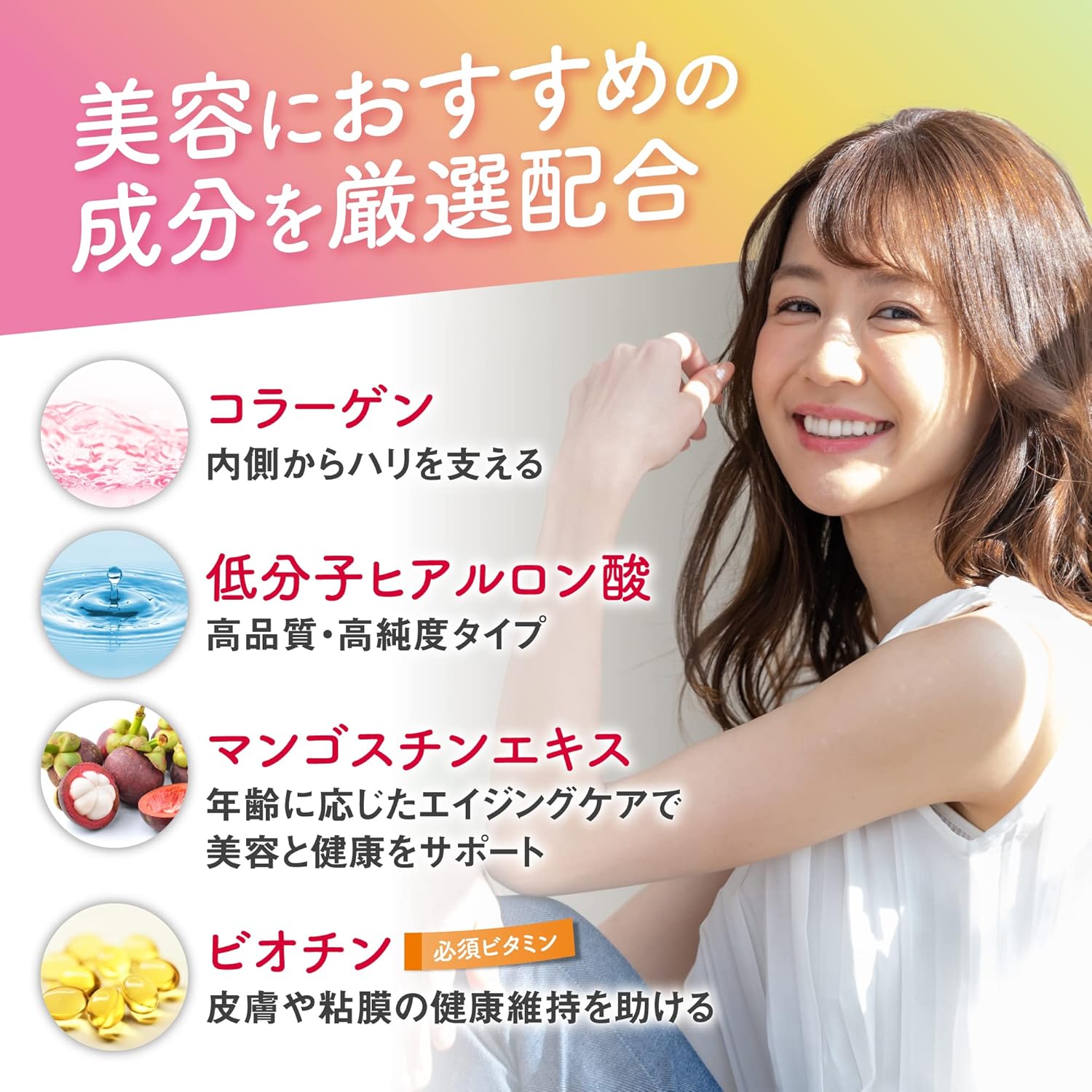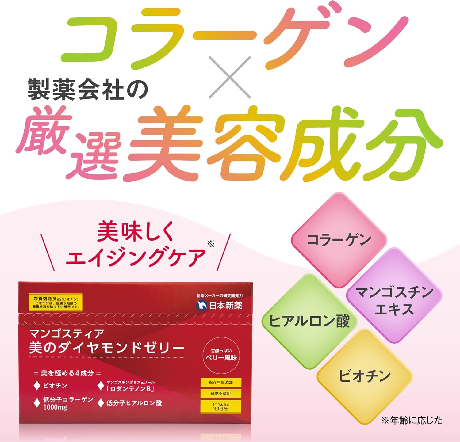 | 特別な原料 | マンゴスチン水溶性ポリフェノール、コラーゲン、ヒアルロン酸、ビオチン |