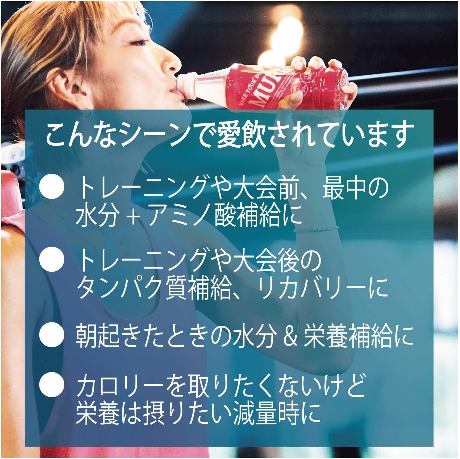 ローディングとはすなわち「読み込む」こと。普段から意識してプロテインを摂取することで、身体がプロテインを取り入れやすくなり、筋肉を酷使する時、プロテインを効率よく利用する回路を働かせ、パフォーマンスアップにつながります。 MURBはいつ飲むのがいいですか? ・トレーニング直後はもちろん、トレーニング前のアミノ酸&プロテインローディングとして、トレーニング中の疲れのリフレッシュや水分補給にも適しています。 ・普段の生活の中でもタンパク質が足りていない日が多いと思うので、仕事中にもオススメです。また食べ過ぎたな、、と感じる時の一食置き換えなどのカロリーコントロールにも◎! ・睡眠中は1日使った身体を回復しようと、体内でタンパク質を分解する働きが起こります。その分のタンパク質を補う必要があるので、朝起きた瞬間や就寝前もオススメです。 白いものがボトルの底に溜まっていたり、浮いていたりするのはなんですか? 白い沈殿物は、時間の経過によりタンパク質が少しずつくっついてしまう現象でございます。成分の沈澱・浮遊について、品質には全く問題ございませんので、ご理解いただけましたら幸いです。 5~10秒程度よく振っていただけましたら、沈殿物がある程度分散いたします。