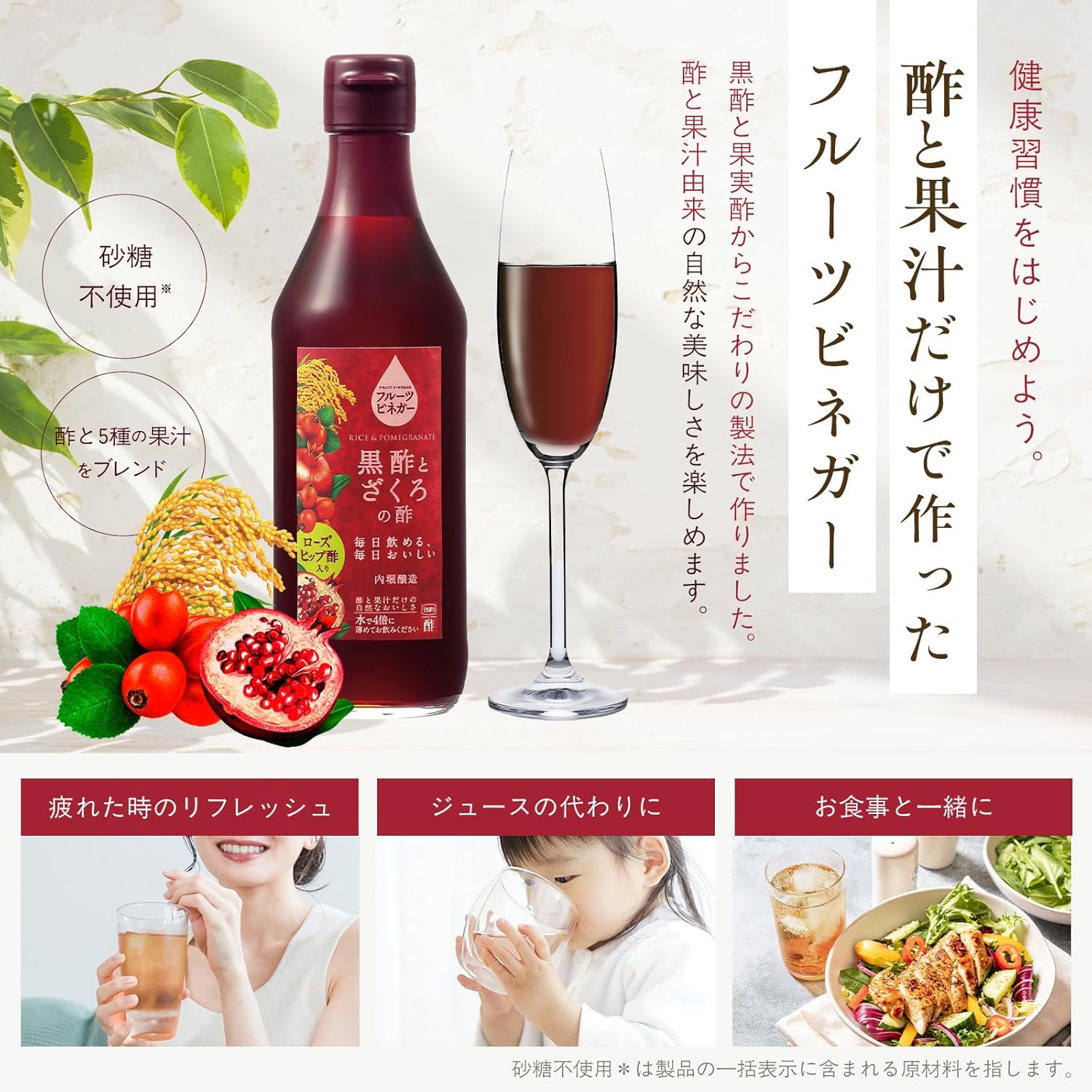 醸造酢(米黒酢、ざくろ酢、ローズヒップ酢、りんご酢)、りんご果汁、ぶどう果汁、ざくろ果汁、ローズヒップ果汁、ラズベリー果汁