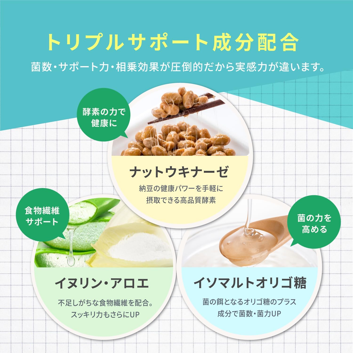 乳酸菌 の効果を向上させるために、3つのサポート成分をたっぷり配合( イヌリン 、 オリゴ糖 、 ナットウキナーゼ )