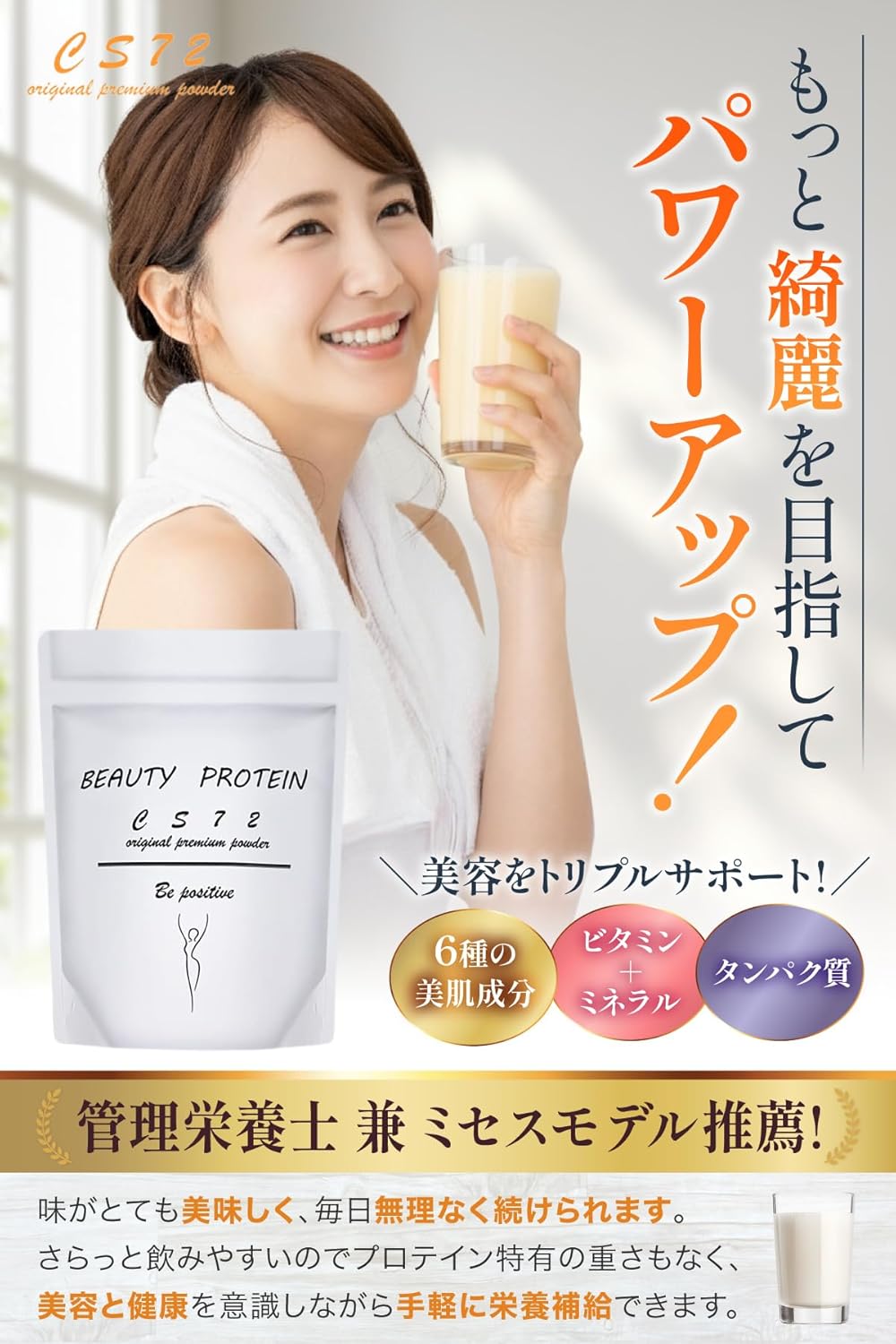 - 【美容と健康を意識した高タンパクのソイプロテイン】BEAUTYPROTEIN CS72は、大豆由来の高タンパクで女性に必要な栄養素がたくさん配合されています。11種のビタミン、必須ミネラル10種、コラーゲンやコエンザイムQ10なども含まれており、美容と健康に優れた栄養素を豊富に含んでいます。