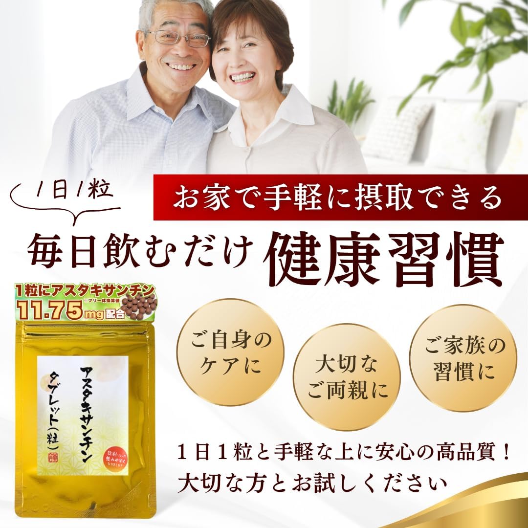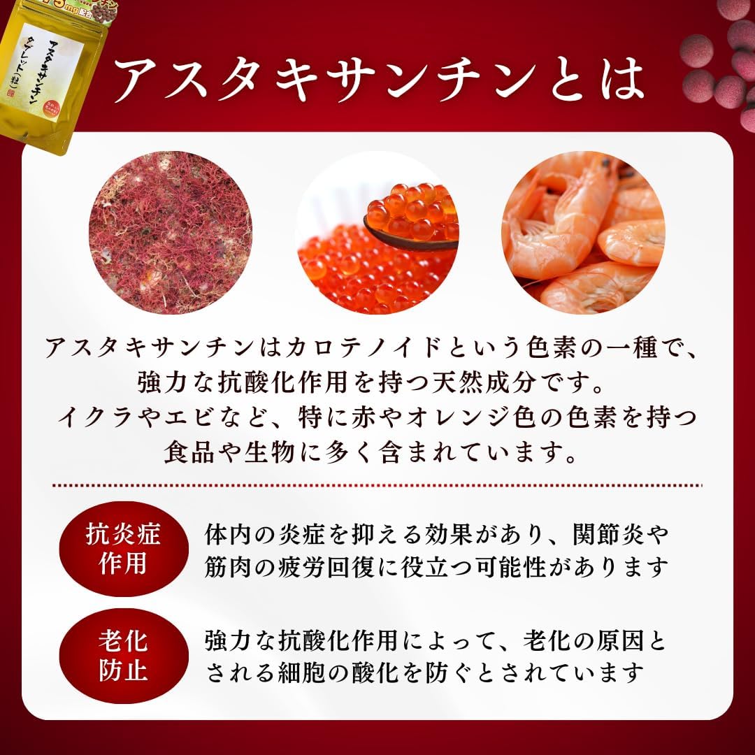 - 原材料:ヘマトコッカス藻エキス末(中国製造)マルトデキストリン/結晶セルロース、ステアリン酸カルシウム、微粒二酸化ケイ素