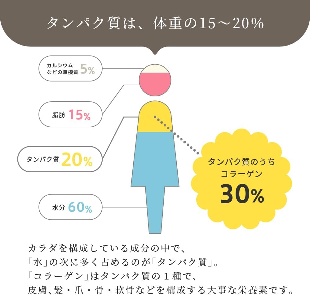カラダを構成している成分の中で、「水」の次に多く占めているのが、実は「タンパク質」。 タンパク質は、体重の15~20%を占め、筋肉や臓器・肌・髪・ホルモン・酵素などの素になる、ヒトが生きていく上で欠かすことのできない栄養素です。