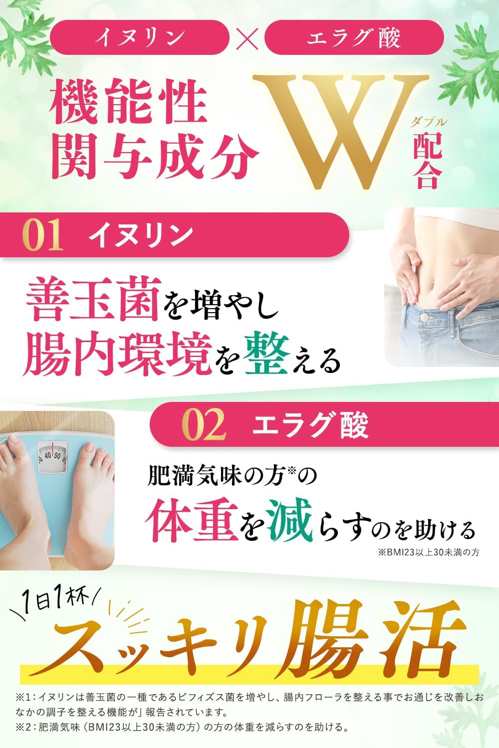 - ◆善玉菌を増やして腸を整える◆ 機能性関与成分「イヌリン」が体内の善玉菌(ビフィズス菌)を増やし、腸内環境を整えます。