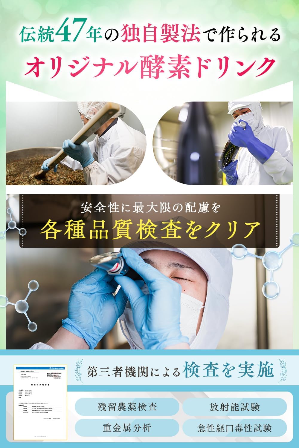 基本的にどなたでもお飲みいただけます。自然の原料を発酵・熟成させた発酵飲料ですのでご自身の健康維持のためにお飲みいただいております。 子どもや妊娠中の方でも飲めますか? 乳幼児、子供、妊婦、授乳期の方や薬を服用中あるいは通院中の方はお医者様にご相談ください。 また、酵素を初めてお召し上がりになる方、お体の体調が気になる方は少量または希釈してお試しいただくことをお勧めいたします。 蓬緑を飲む目的はなんでしょうか? 蓬緑腸活ケアには2つの機能性関与成分を配合しています。イヌリンは腸内にある善玉菌(ビフィズス菌)を増やし、腸内フローラを整えます。エラグ酸は肥満気味(BMI23以上30未満)の方の体重、体脂肪の減少をサポートし、高めのBMI値の改善を助けます。 1日に飲む量に制限はありますか? 特に決まりはありませんが、酵素を始めてお召し上がりになる方、お体の体調が気になる方は少量、または希釈してからお試し頂くことをお勧めいたします。 どのくらいの期間、飲み続ければいいですか? 「最低でも3ヶ月〜半年は続けていただきたい」というのが私たちの本音です。蓬緑は選び抜かれた全80種類(野草・海藻・果物・野菜)もの原材料を伝統47年の独自技術によって発酵させることでギュッと栄養を凝縮した酵素ドリンク。そのため続けて頂くことで「あなたのお悩みにしっかりとお応えできる」という『自信』があります。