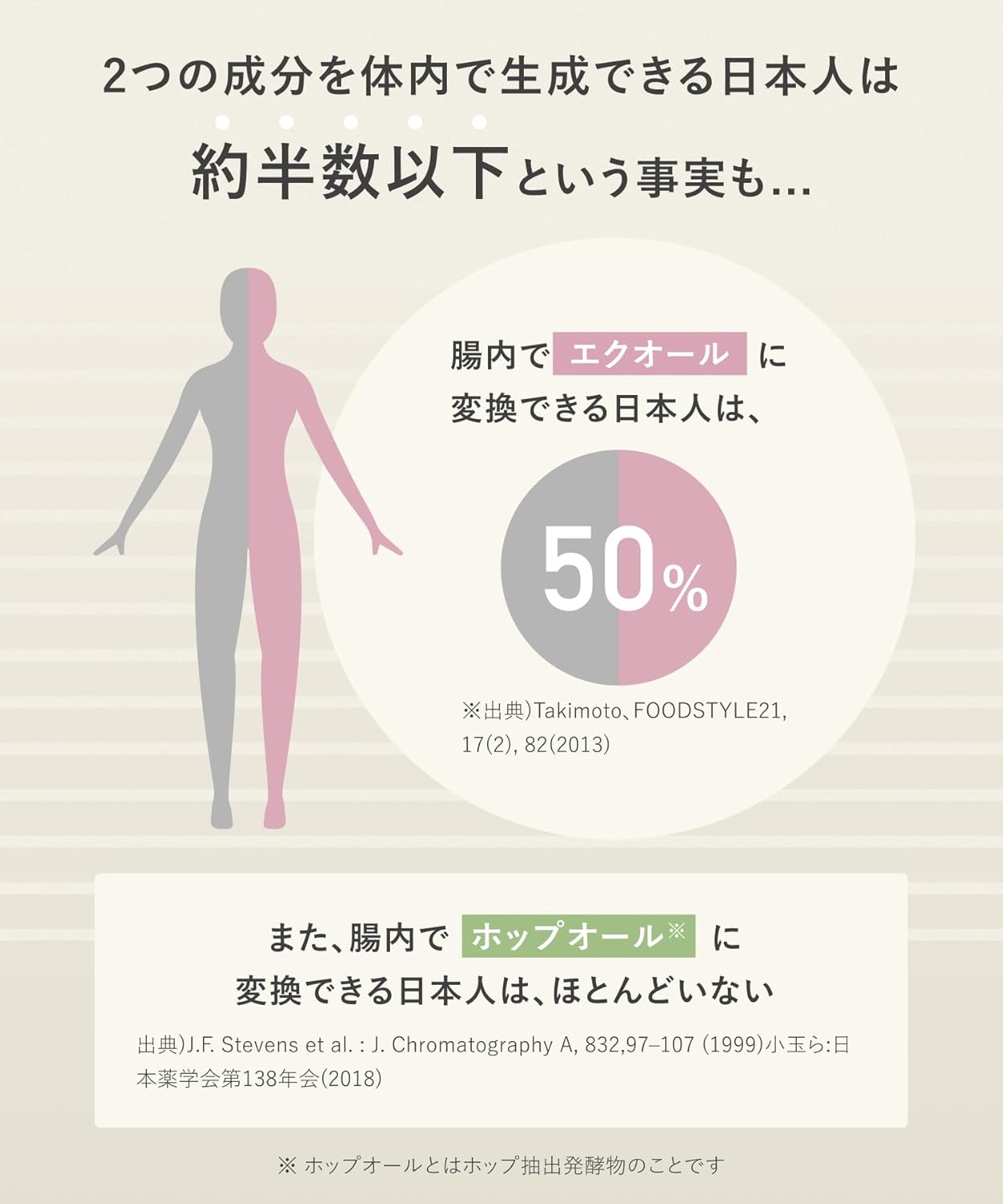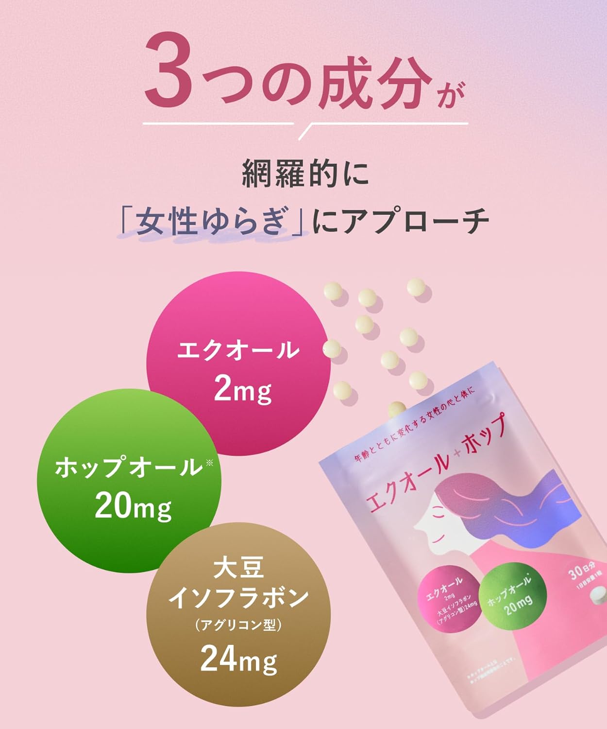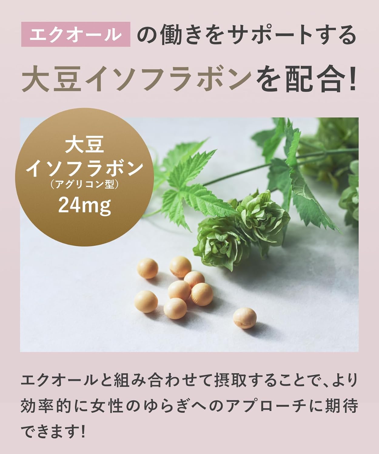 - 【主要成分】エクオール2mg、大豆イソフラボン(アグリコン型)24mg、ホップオール20mg