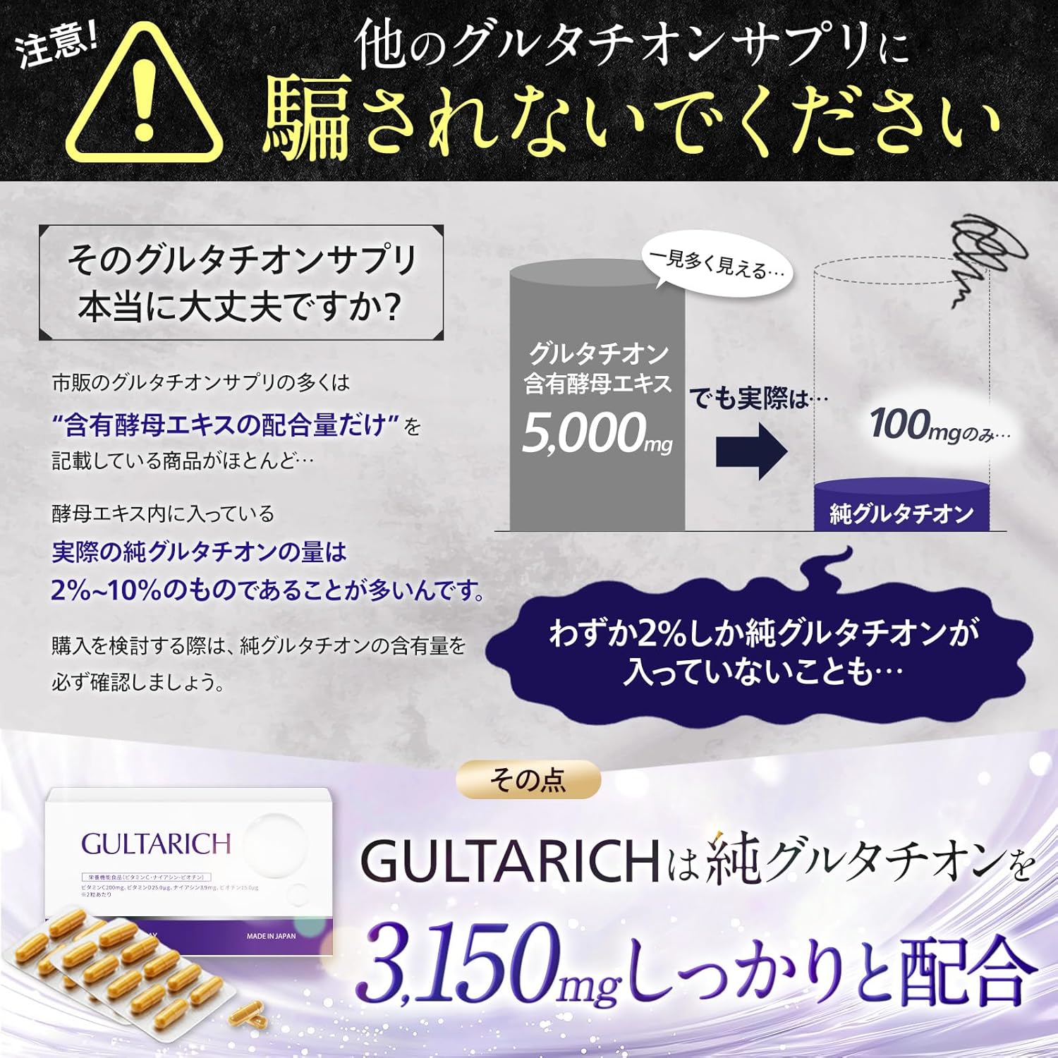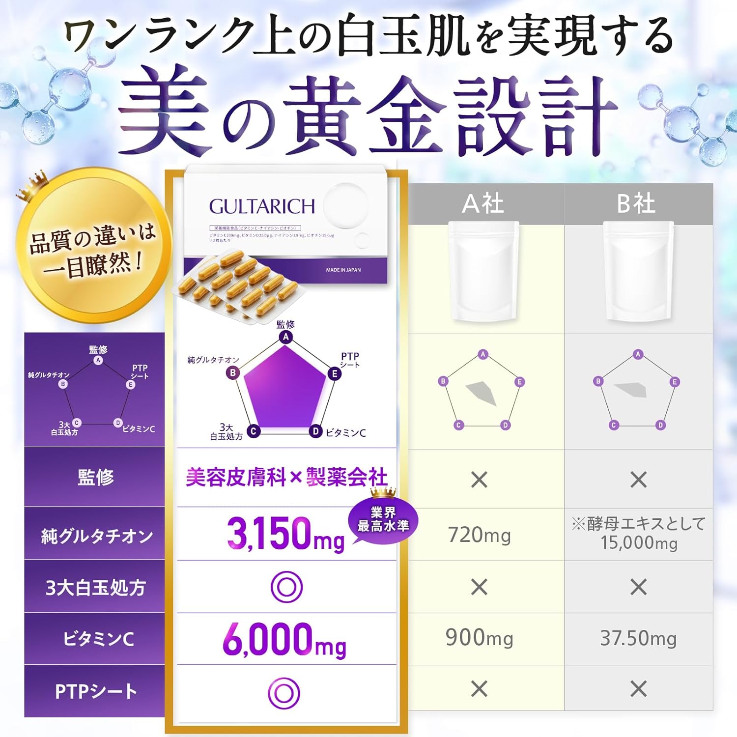 - ✅【国内GMP認定工場で製造】 GULTA RICHは、厳格な品質管理体制のもと、国内GMP認定工場で製造。 すべての工程で品質の安定性と安全性を徹底し、安心して続けられる品質をお届けします。