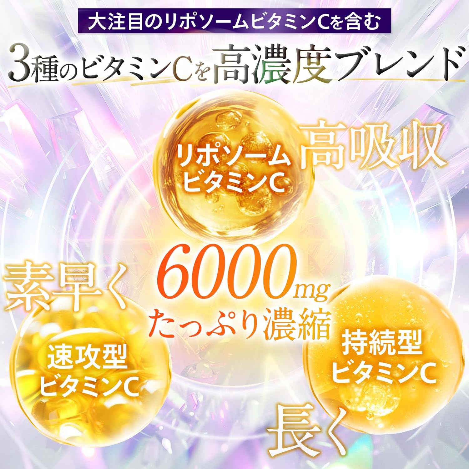 - ✅【3種のビタミンCを高濃度配合】 「高吸収型」「速攻型」「持続型」の3種ビタミンCを、独自バランスでブレンド。 体内で長く・しっかり働くよう設計された、持続力×吸収力を兼ね備えた“次世代型ビタミンC処方”です。