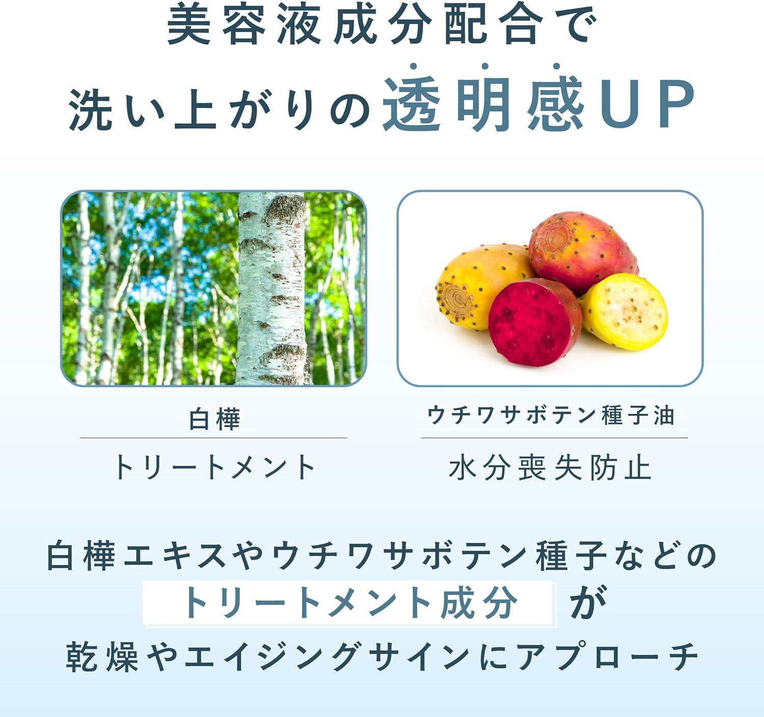 - ≪ POINT3 ≫ トリートメント機能で洗いあがりもちもち、透明感UP。3種の植物から抽出したボタニカルバリアCPX※3とスーパーフードとして注⽬されているタイガーナッツによって肌のバリア機能をサポートしながら、肌の⽔分蒸散を防ぐ。洗いあがりはしっとりとした吸い付くような肌に。 ※3 フウセンカズラ花/葉/つるエキス、エチウムプランタギネウム種⼦油、ヒマワリ種⼦油不けん化物