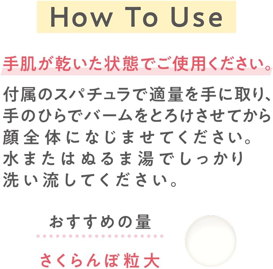 手の圧でバームが崩れて素早くオイル化。 じゅわっととろける使用感で、しっかりメイクもするんとうるオフ。 毛穴に入り込んだ皮脂汚れやザラつきもすっきりオフ。 美容保湿成分12種(水添レシチン、セラミドNG、セラミドAP、セラミドAG、セラミドNP、セラミドEOP、アセチルヒアルロン酸Na、ホホバ種子油、シア脂、スクワラン、ツボクサ葉エキス、パルミチン酸レチノール)配合。 メイクはすっきりオフするのにしっとりうるおいのある洗いあがり。