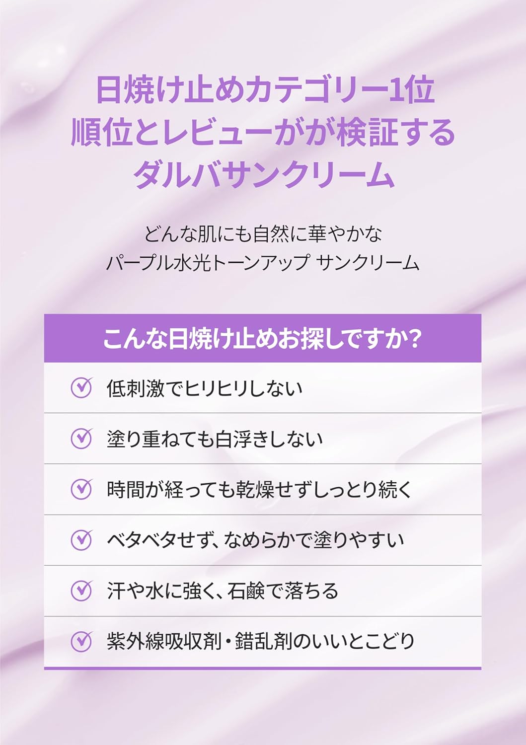 Previous page Next page 1 Tone-Up Sun Cream Purple 2 レビュー 3 紫外線カット 4 どんな肌にも合う 5 おすすめの使い方