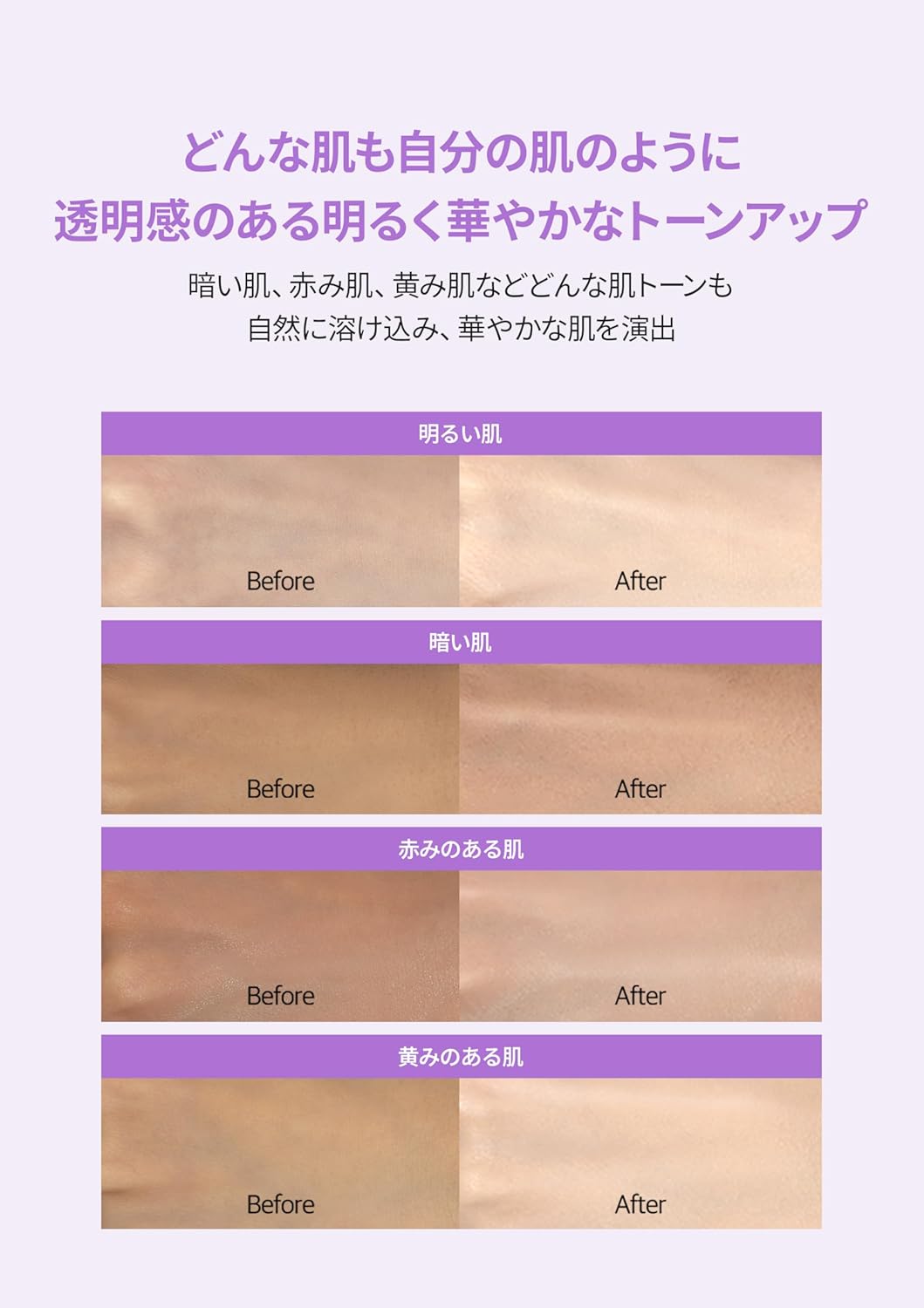 - 💜【パープルトーンアップ用(くすみ・黄ぐすみ)】肌の黄ぐすみやくすみ感を自然に補整し、素肌のように澄んだ明るさを演出。どんな肌トーンにもなじみやすく、透明感のある印象へ導きます。