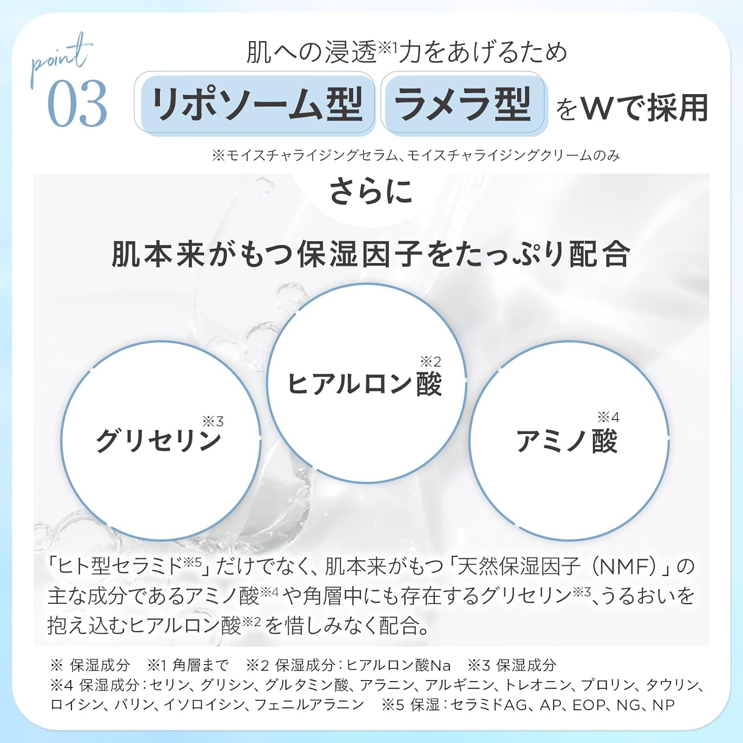 - ✅Point1 :「ヒト型セラミド※1」高濃度※2配合で、しなやかなもっちり肌へ ※1 保湿成分:セラミドAG、AP、EOP、NG、NP ※2 当社製品内