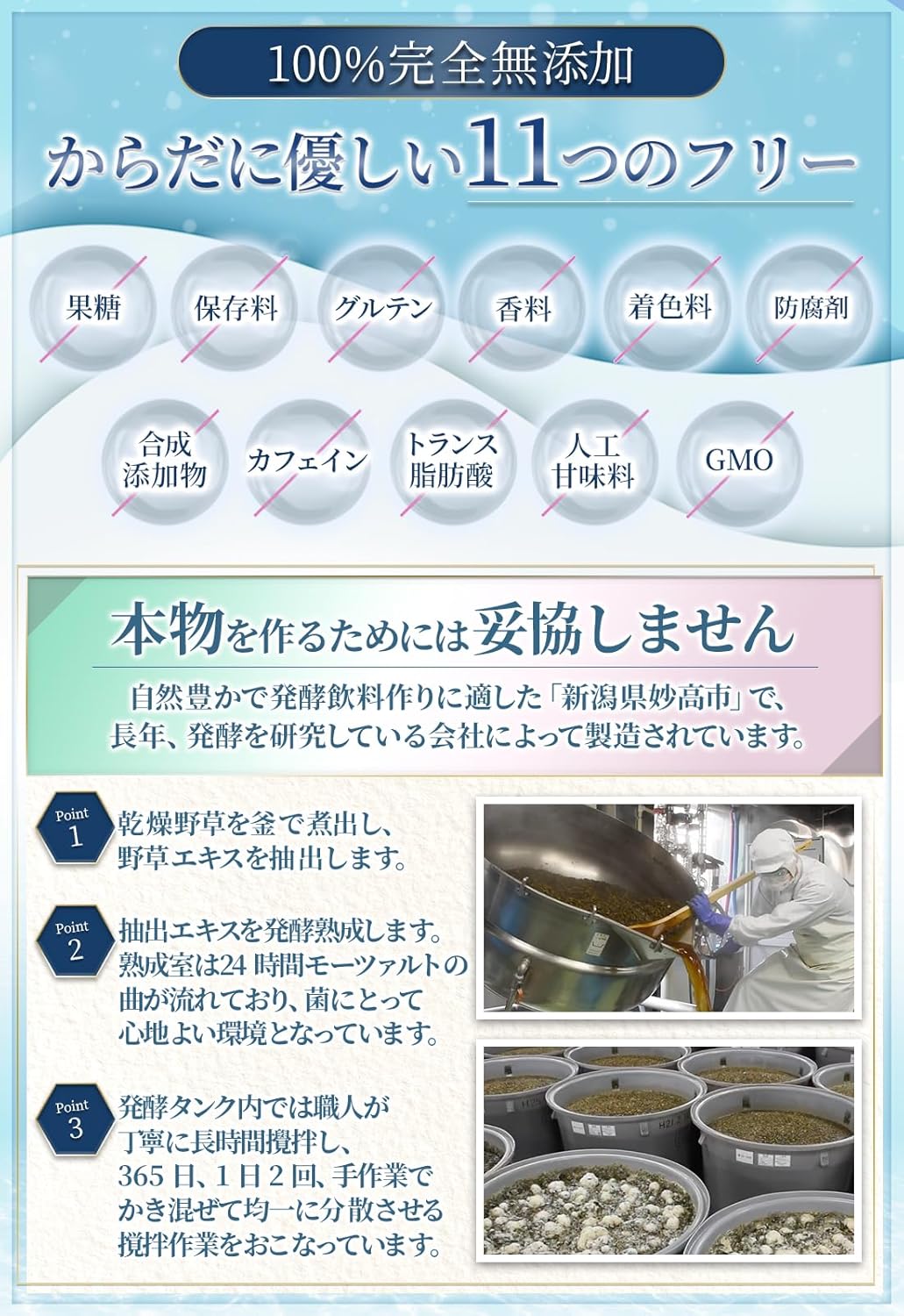 - ✅【こだわりの原材料】1年半以上をかけて自然発酵熟成させている原材料は実に60種類以上。製造するにあたって使用している植物性乳酸菌の数も50種類以上となっています。