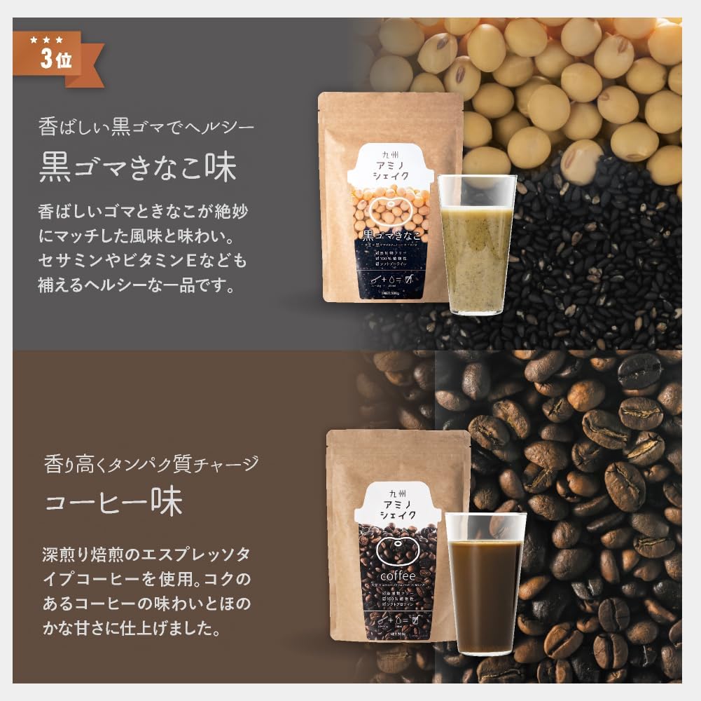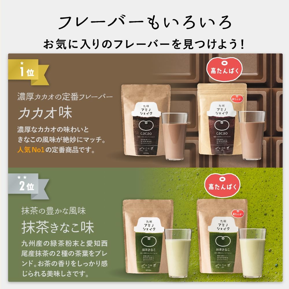 「九州アミノシェイク」は、100%植物性の、美容と健康にやさしいプロテイン。ナチュラルな甘さと風味が魅力です。お気に入りのフレーバーを見つけて、健康的にたんぱく質をチャージ♪