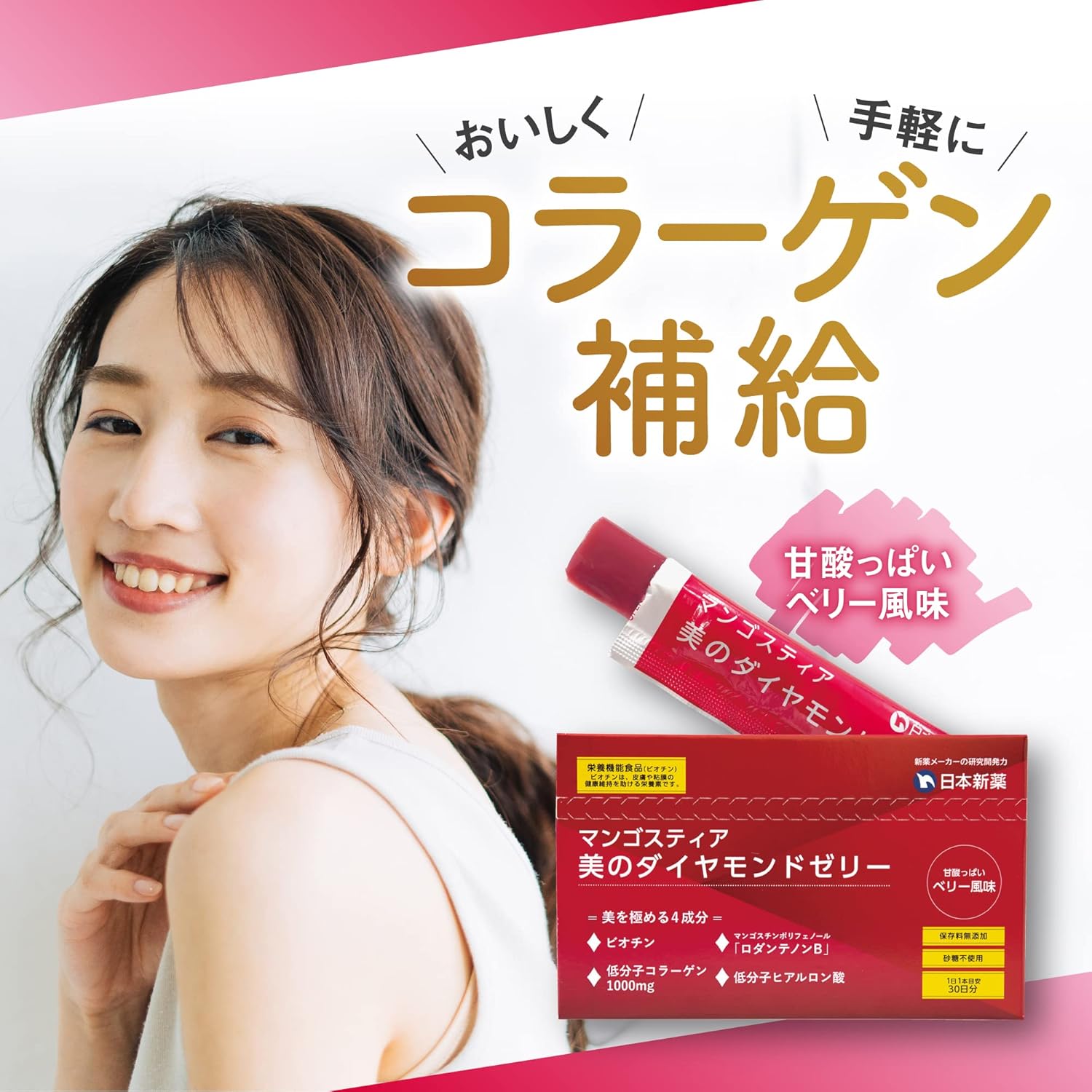 | 特別な原料 | マンゴスチン水溶性ポリフェノール、コラーゲン、ヒアルロン酸、ビオチン |