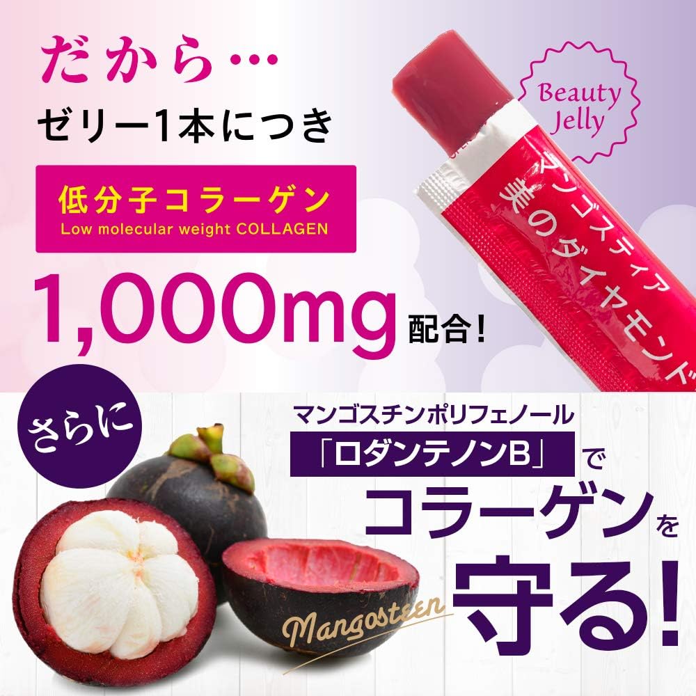 ヒトのタンパク質のうち約30%が「コラーゲン」といわれ、肌や骨、関節・血管、筋肉(筋膜)などに含まれています。しかし、体内のコラーゲンは年齢を重ねるごとに減少してしまいます。 さらに、コラーゲンの量が減るだけでなく、衰えてしまいます。 だからこそ、コラーゲンを「補う」&「守る」ことが大切です。 ◆コラーゲンを「補う」: 高品質な「低分子フィッシュコラーゲン」を、ゼリー1本にぎゅッと1,000mg配合! ◆コラーゲンを「守る」: 南国の強い紫外線から、白く柔らかな果肉を守る希少なマンゴスチンポリフェノール「ロダンテノンB」を配合。