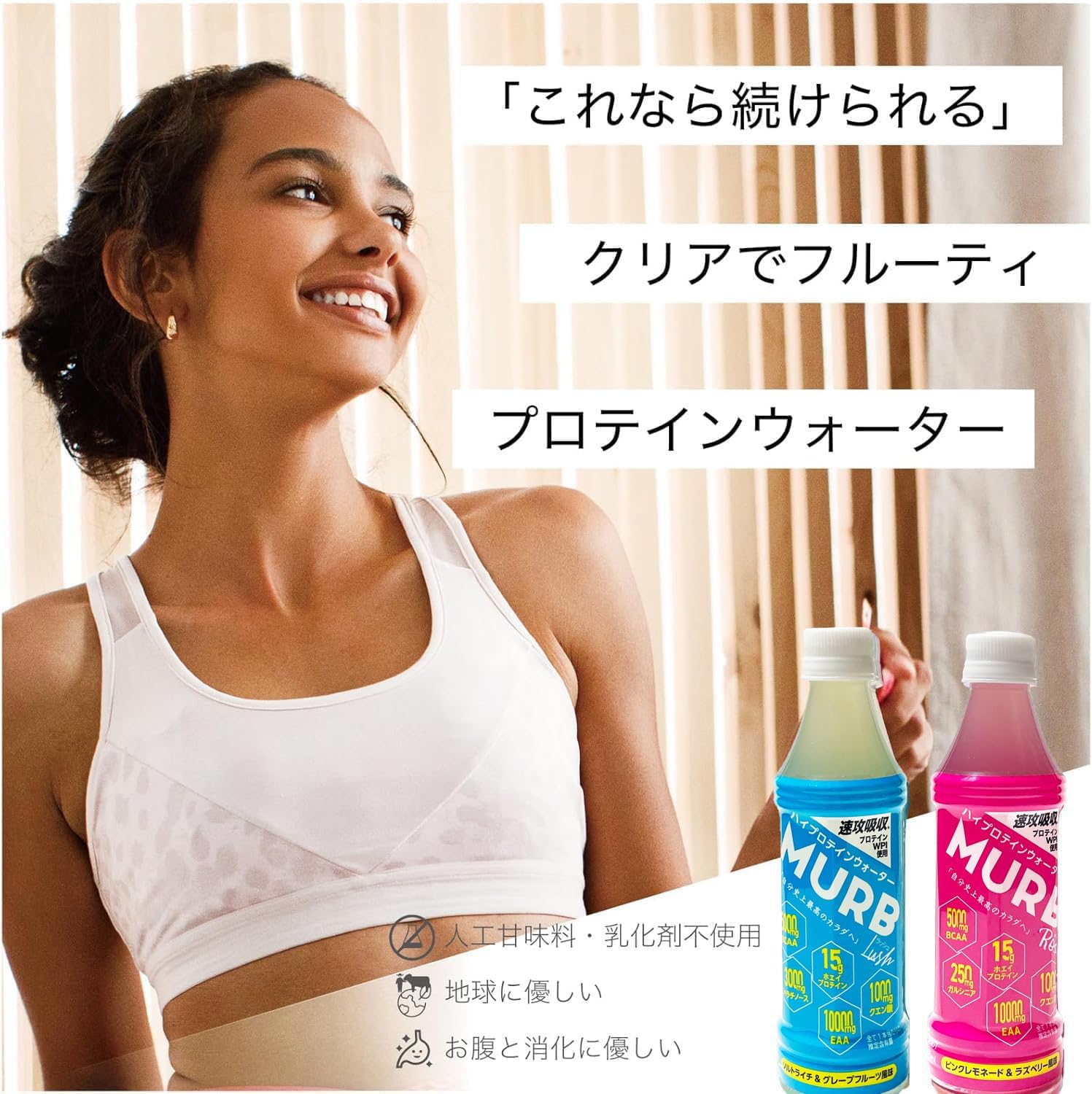 ただ、プロテインが水に溶けている訳ではない。ユーザーのパフォーマンスをより引き出す事ができるようこだわった配合設計。そして、繊細な女性にも継続的に飲んでほしいからこそ、人工甘味料や保存料ゼロ、乳化剤ゼロも達成しました。