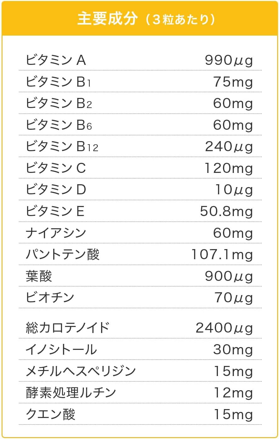 - 🌈【成分:3粒中】ビタミンA 990μg、ビタミンB1 75mg、ビタミンB2 60mg、ビタミンB6 60mg、ビタミンB12 240μg、ビタミンC 120mg、ビタミンD 10μg、ビタミンE 50.8mg、ナイアシン 60mg、パントテン酸 107.1mg、葉酸 900μg、ビオチン 70μg、総カロテノイド 2,400μg、イノシトール 30mg、メチルヘスペリジン 15mg、酵素処理ルチン 12mg、クエン酸 15mg