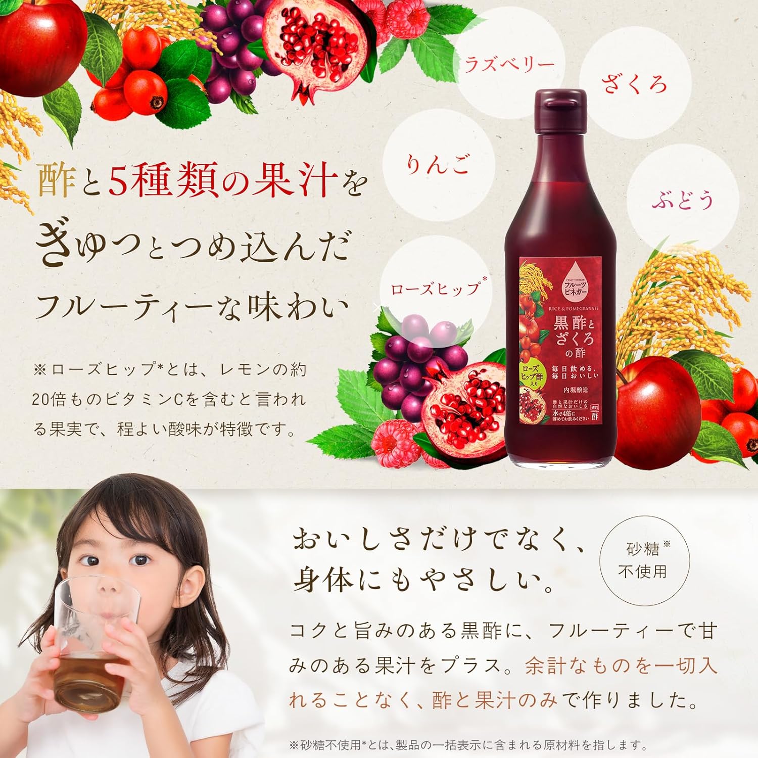 醸造酢(米黒酢、ざくろ酢、ローズヒップ酢、りんご酢)、りんご果汁、ぶどう果汁、ざくろ果汁、ローズヒップ果汁、ラズベリー果汁