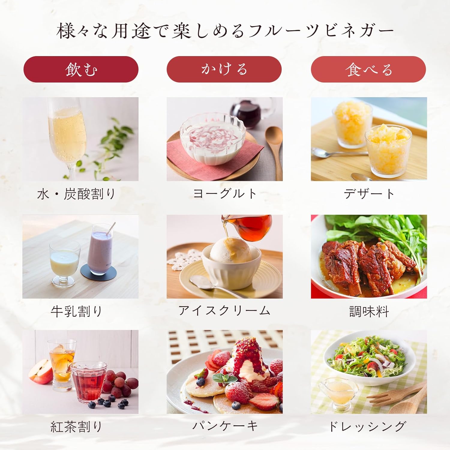 手作りサラダドレッシング フルーツビネガーにサラダ油と塩・こしょうを混ぜるだけ。フルーティーな香りとやさしい酸味が広がる、手作りドレッシングです。 グリークヨーグルト 濃厚でもっちり食感のグリークヨーグルト。フルーツビネガーをかけると、フルーティーで食べやすくなります。はちみつも相性抜群です。 しっとりビネガーケーキ フルーツビネガーの自然の甘みとやさしい酸味を感じる、大人のためのしっとりケーキ。お好みでドライフルーツやナッツを入れても美味しく召し上がれます。 マシュマロトースト 朝食やおやつにぴったりな、とろーっと甘酸っぱいマシュマロトーストです。マシュマロの甘さとフルーツビネガーの酸味、バターの香ばしい風味が相性抜群です。