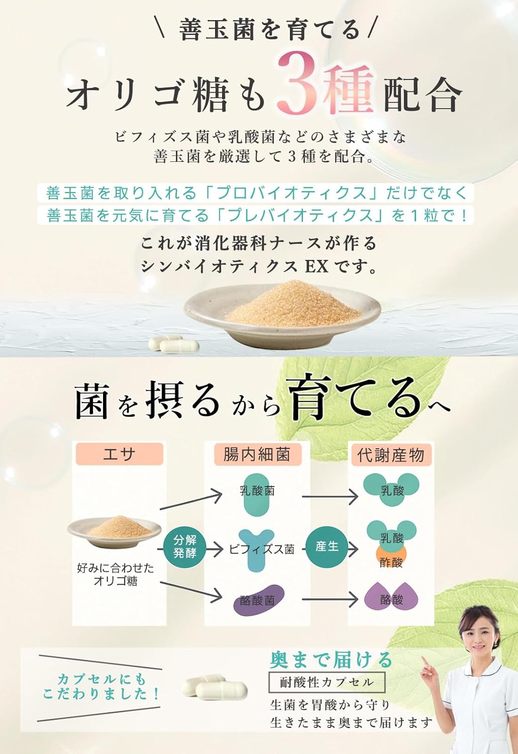 - ✅【菌を育てる新しい育菌習慣】消化器科の現役看護師が監修して作った腸活サプリ。シンバイオティクスEXは、生きた細菌(プロバイオティクス:生菌)とオリゴ糖を選択的に組み合わせ「菌を育てる」新しい菌活サプリメントです。あなたの体に寄り添い腸内環境をサポートします。