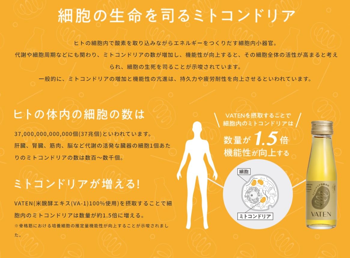 ミトコンドリアに着目した新しいエナジードリンク「VATEN」は、福光屋の日本酒や糀甘酒の米醗酵技術を応用し、細胞・身体機能に有用な米醗酵由来の栄養素を可能な限り高めた天然成分100%のエナジードリンクです。アミノ酸やクエン酸、ポリフェノール(フェルラ酸やp-クマル酸)などを含有。毎日の健康維持にお役立ていただけます。 米と米麹のみ使用/国産契約栽培米100%/無添加(保存料・香料)/ノンカフェイン