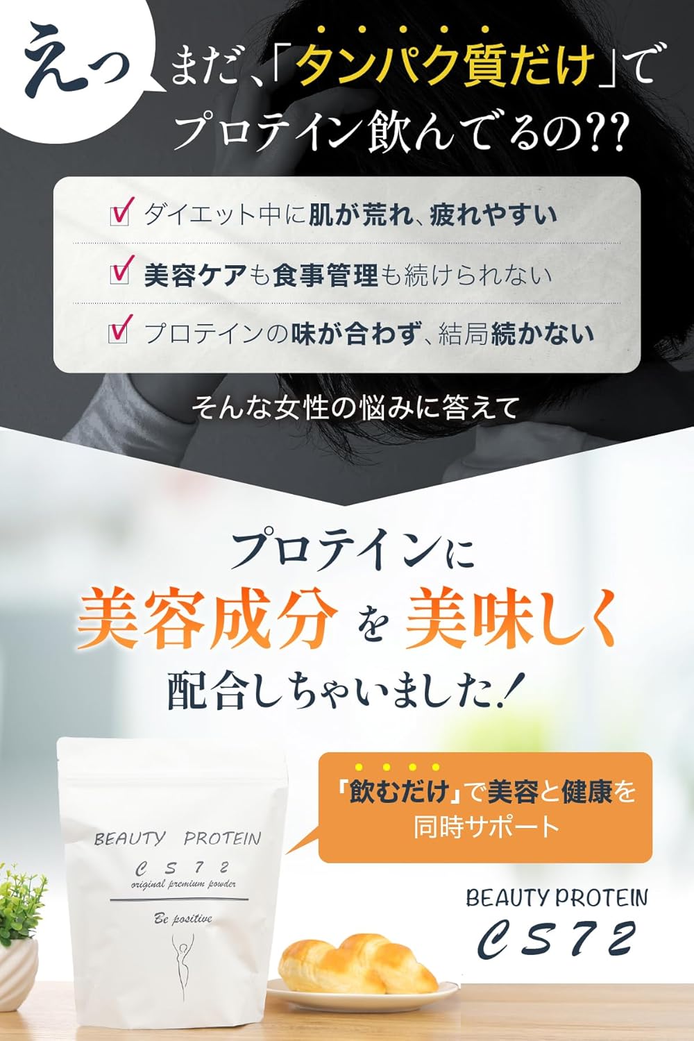 - 【美容と健康を意識した高タンパクのソイプロテイン】BEAUTYPROTEIN CS72は、大豆由来の高タンパクで女性に必要な栄養素がたくさん配合されています。11種のビタミン、必須ミネラル10種、コラーゲンやコエンザイムQ10なども含まれており、美容と健康に優れた栄養素を豊富に含んでいます。