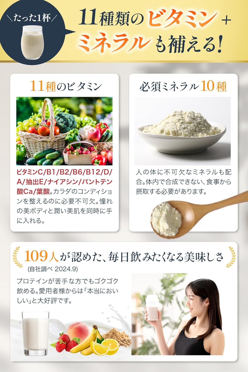 - 【11種類のビタミンと10種類の必須ミネラルが含まれた栄養素を多く配合】この商品は11種類ものビタミンや10種類もの必須ミネラルを含んでいます。さらに、美肌成分として知られるコエンザイムQ10や食物繊維も配合されております。きなこ風味で飲みやすく、毎日手軽に栄養補給が可能です。