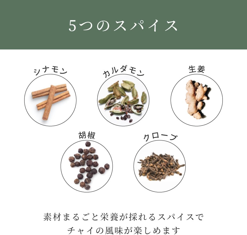鹿児島県産有機抹茶使用 茶カテキンやテアニン、ビタミンなどの豊富な栄養素を含む抹茶は美容や健康面でも注目されています。抹茶ならではの豊かな風味と味わいをお楽しみいただけます。 まるごと栄養が摂れるスパイス シナモン、カルダモン、クローブ、生姜、胡椒を粉末にして配合。素材まるごと栄養が摂れるスパイスで、チャイの風味が楽しめます。隠し味にぬちまーすⓇ入り。 アミノ酸スコア100 バランスよくアミノ酸を摂取できるので、栄養補給やトレーニングを目的とされる時もおすすめです。アミノ酸スコアの数値は0~100まであり、100に近いほど質の良いタンパク質と言われています。 栄養豊富なプロテイン ヘンププロテインは、ヘンプシードを低温圧搾した後に残る、オイル以外の固形物を粉末化した植物性タンパク質。化学的な精製・分離を行っていないため、タンパク質だけでなく、食物繊維や必須アミノ酸、ミネラル類が豊富に含まれています。