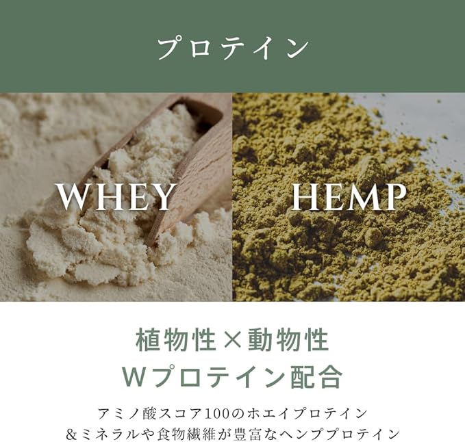 - アミノ酸が豊富で消化吸収されやすいホエイプロテインと、ミネラルや食物繊維を含むヘンププロテインの2種類を配合しており、植物性×動物性のプロテインをバランスよく取り入れたい方におすすめです。