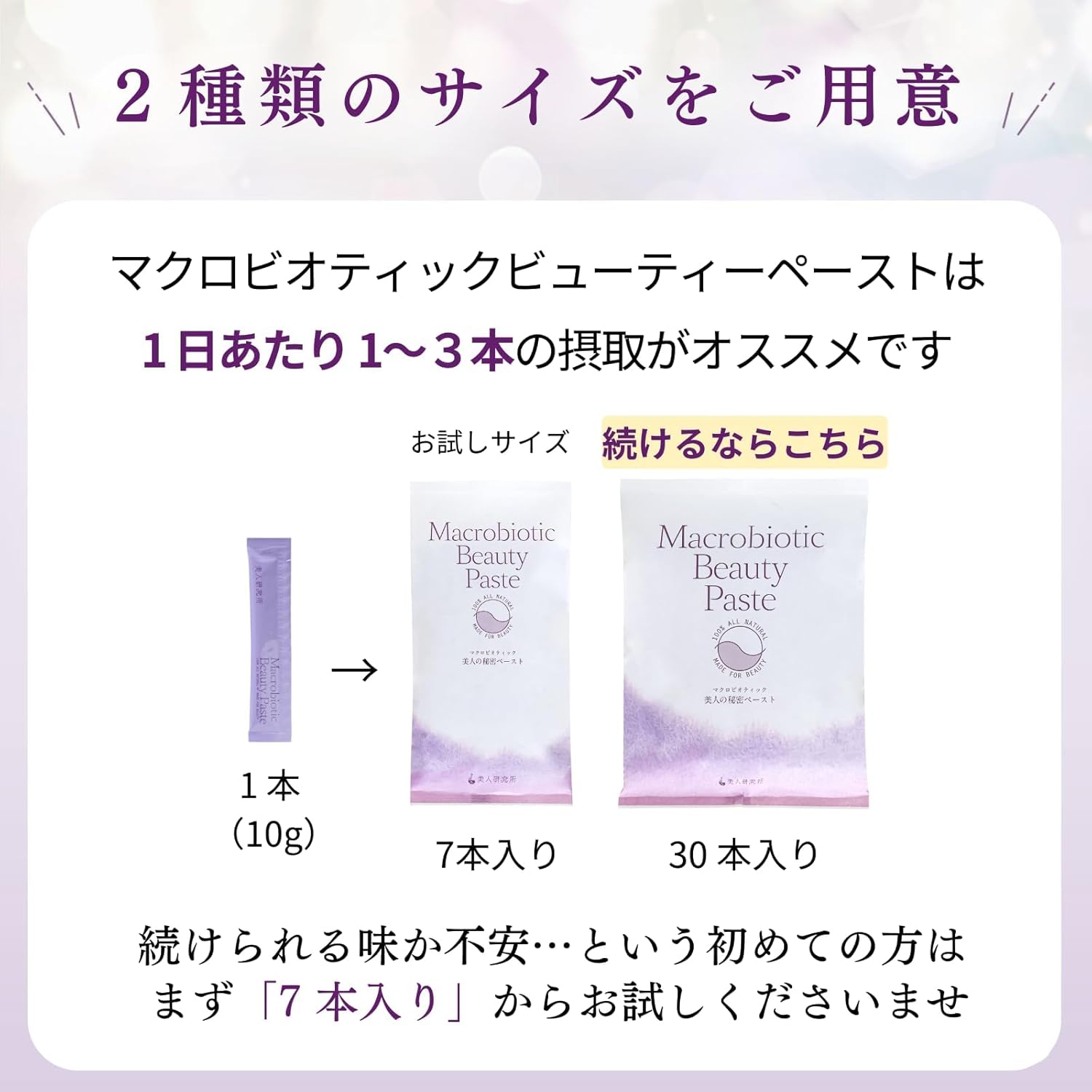マクロビオティックビューティーペースト 7本入り(1本10g) 酵素ペースト マクロビオティックビューティーペースト 30本入り(1本10g) 酵素ペースト マクロビオティックビューティーペースト 60本入り(1本10g) 酵素ペースト カスタマーレビュー 5つ星のうち4.6 29 5つ星のうち4.6 29 5つ星のうち4.6 29 価格 ¥2,268¥2,268 ¥8,856¥8,856 ¥16,200¥16,200 特徴 まずはお試し7本から【MBPで手軽に発酵習慣】発酵食品であるMBPには、善玉菌の栄養源となる成分が含まれています。日々の食事に取り入れることで、内側からの健康維持をサポートします。 しっかり毎日30本【MBPで手軽に発酵習慣】発酵食品であるMBPには、善玉菌の栄養源となる成分が含まれています。日々の食事に取り入れることで、内側からの健康維持をサポートします。 60本【MBPで手軽に発酵習慣】発酵食品であるMBPには、善玉菌の栄養源となる成分が含まれています。日々の食事に取り入れることで、内側からの健康維持をサポートします。