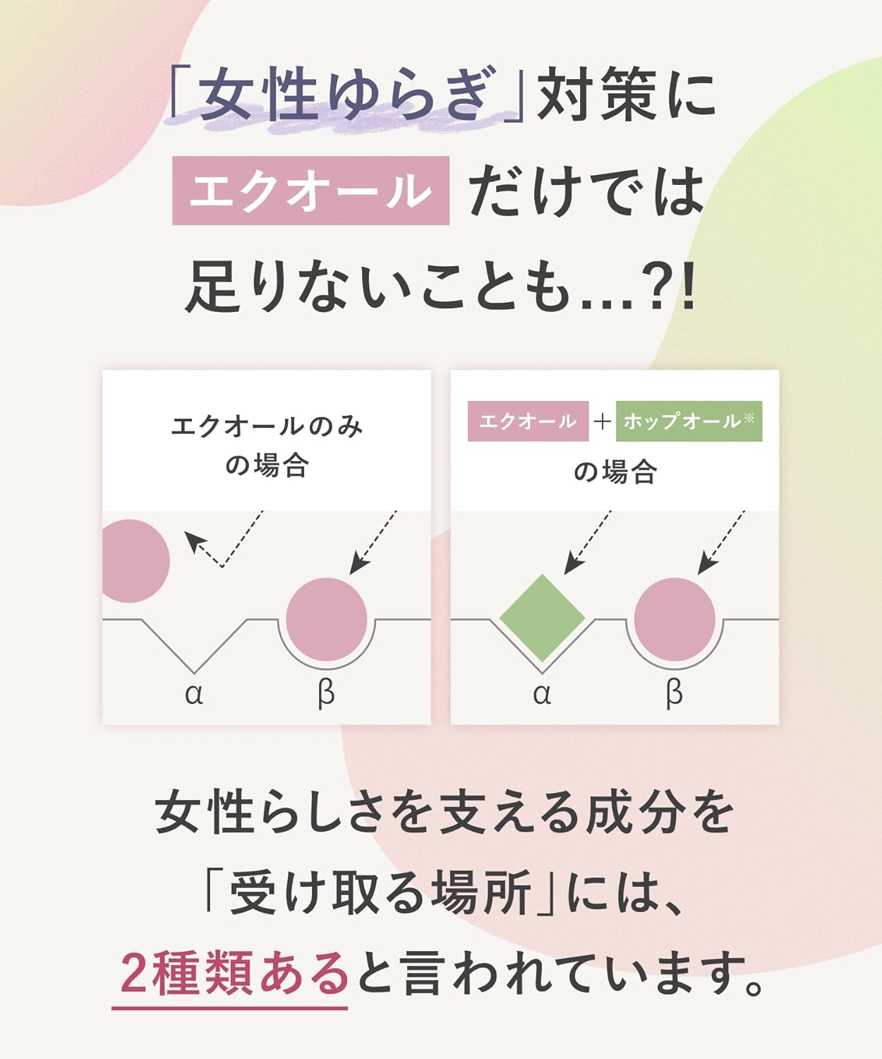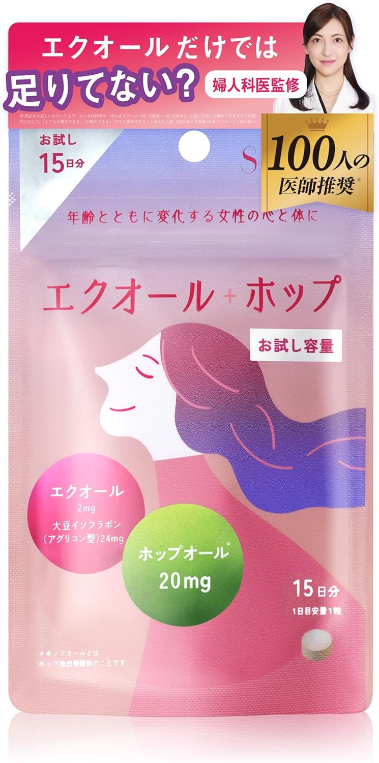 - 【主要成分】エクオール2mg、大豆イソフラボン(アグリコン型)24mg、ホップオール20mg