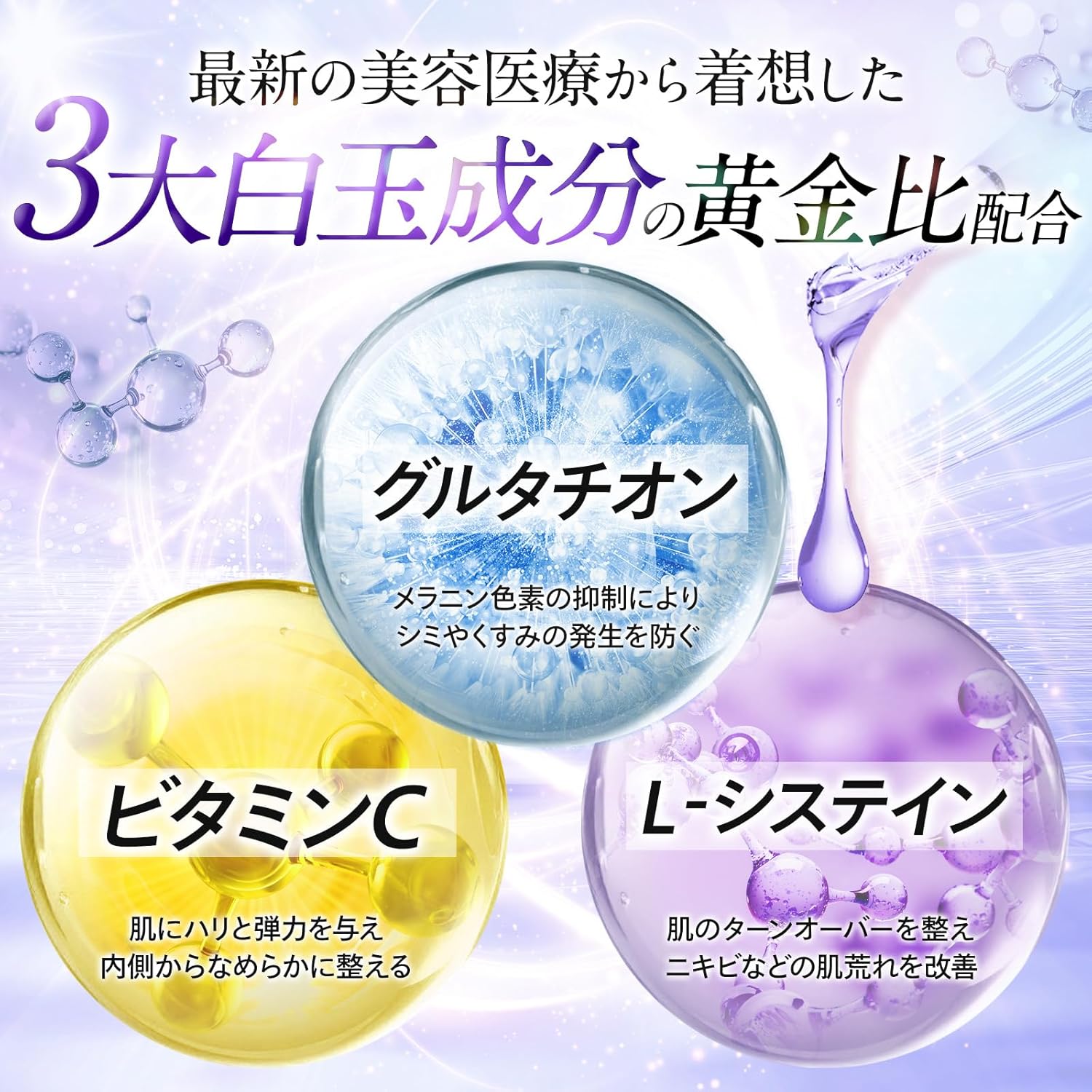 【3大白玉成分*グルタチオン×ホワイトトマト×リポソームビタミンCを一粒に】 内側から輝く美しさを支えるアミノ酸成分「グルタチオン」を、3,150mgと高配合。 さらに、美白ケアで注目される「ホワイトトマト」と、吸収効率に優れた「リポソームビタミンC」を贅沢にブレンド。透明感のある“白玉級の肌印象”を目指す方に寄り添う、美容サプリメントです。