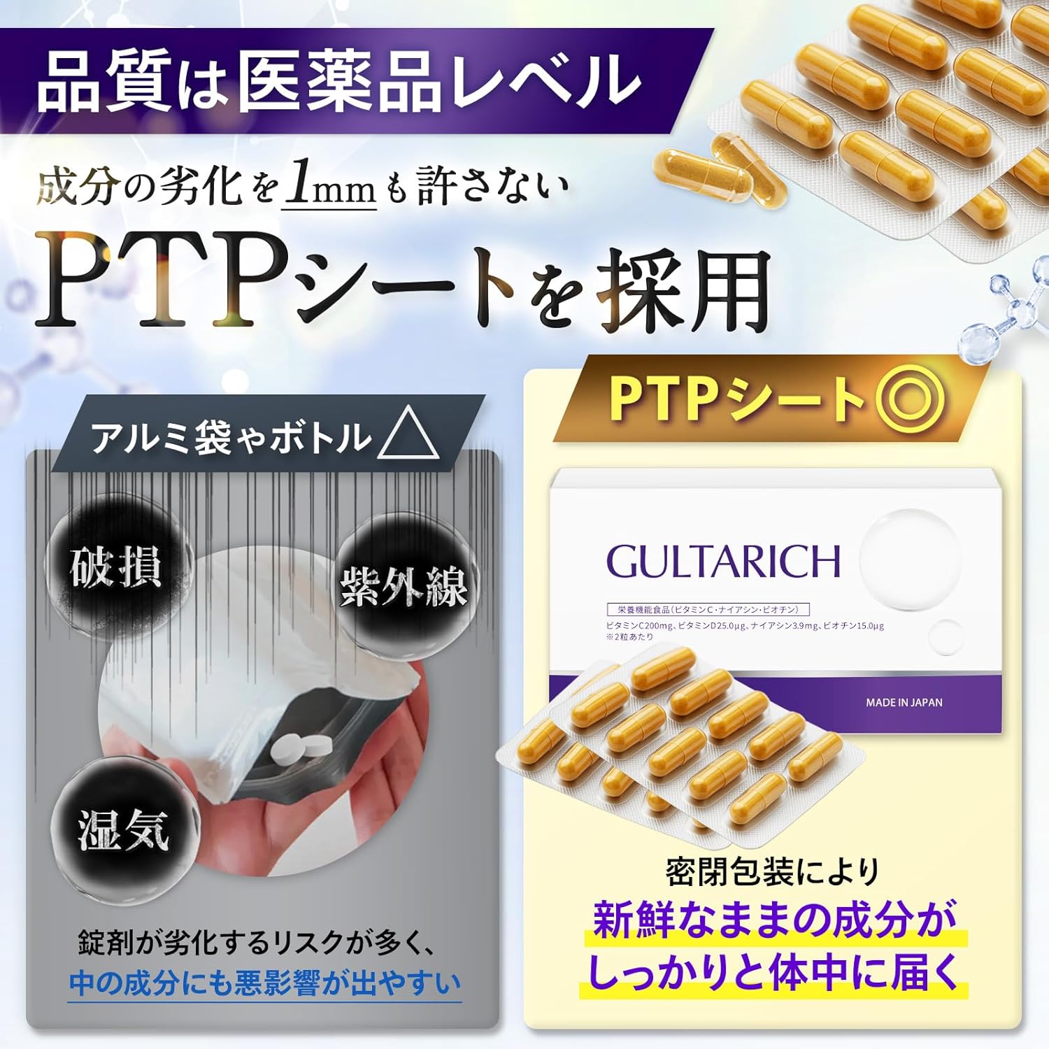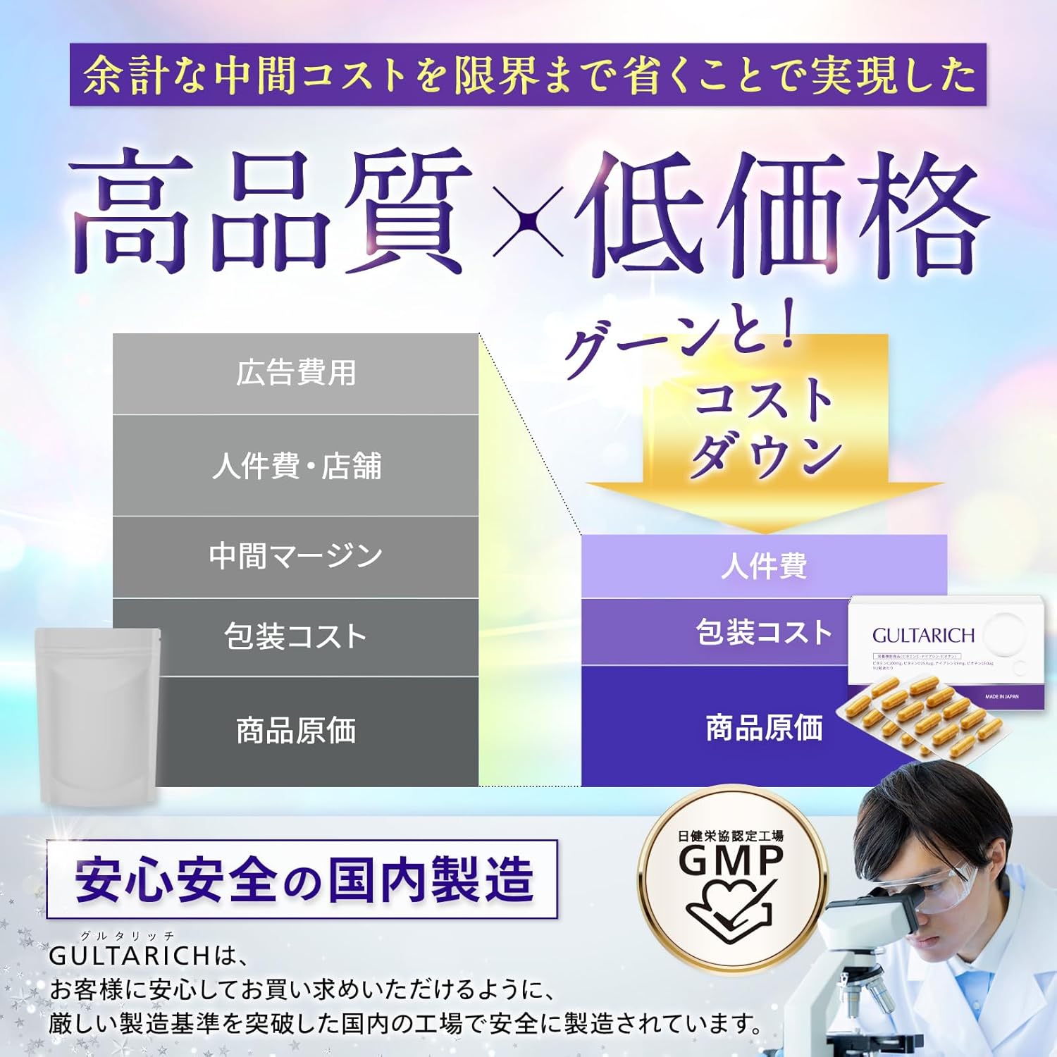 - ✅【国内GMP認定工場で製造】 GULTA RICHは、厳格な品質管理体制のもと、国内GMP認定工場で製造。 すべての工程で品質の安定性と安全性を徹底し、安心して続けられる品質をお届けします。