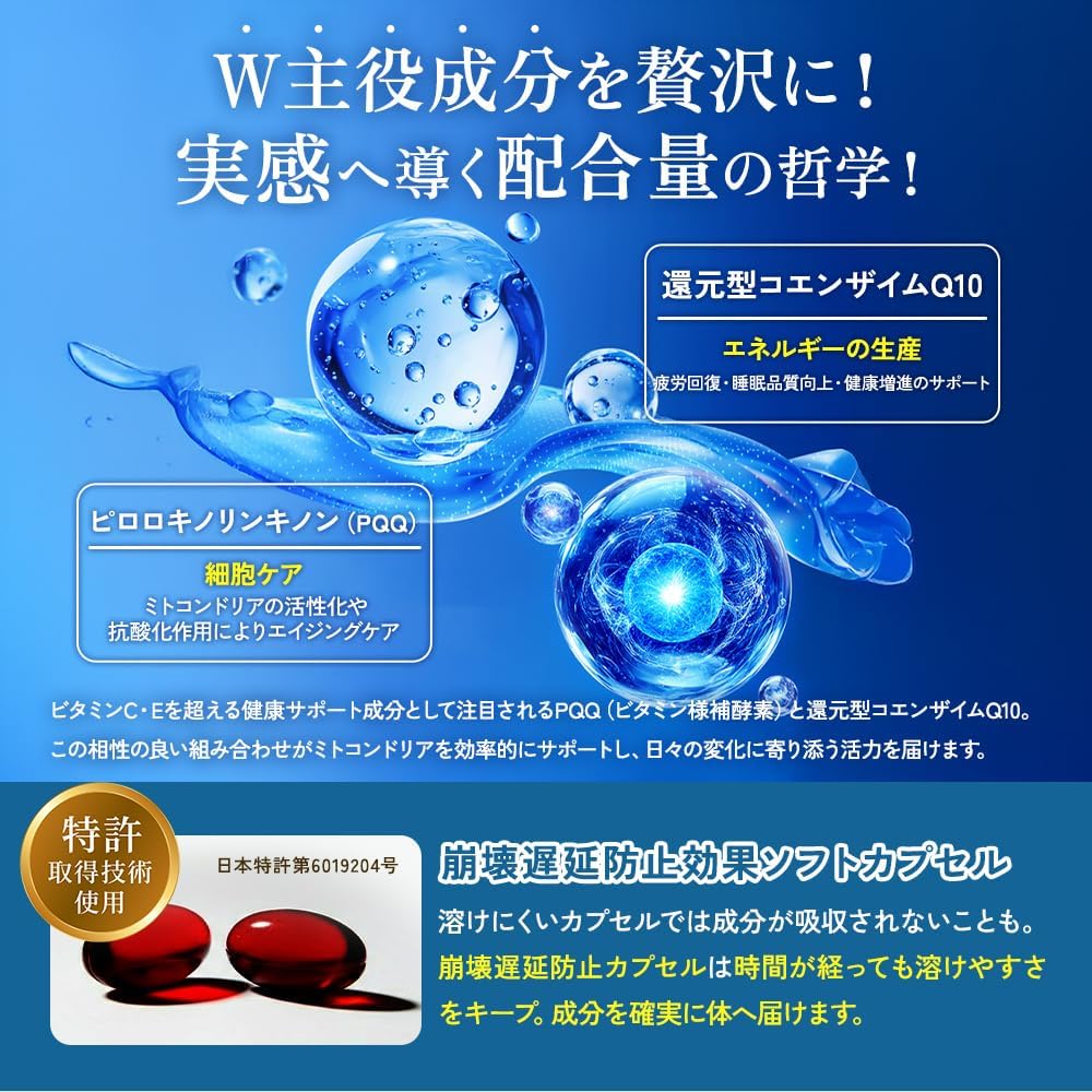 - 【商品詳細】1日の目安:2粒 / 特許取得成分 (1日2粒当たり) 還元型コエンザイムQ10 100mg、PQQ(ピロロキノリンキノン) 20mg / ※本品は、特定保健用食品と異なり、消費者庁長官による個別審査を受けたものではありません。※食生活は、主食、主菜、副菜を基本に、食事のバランスを。