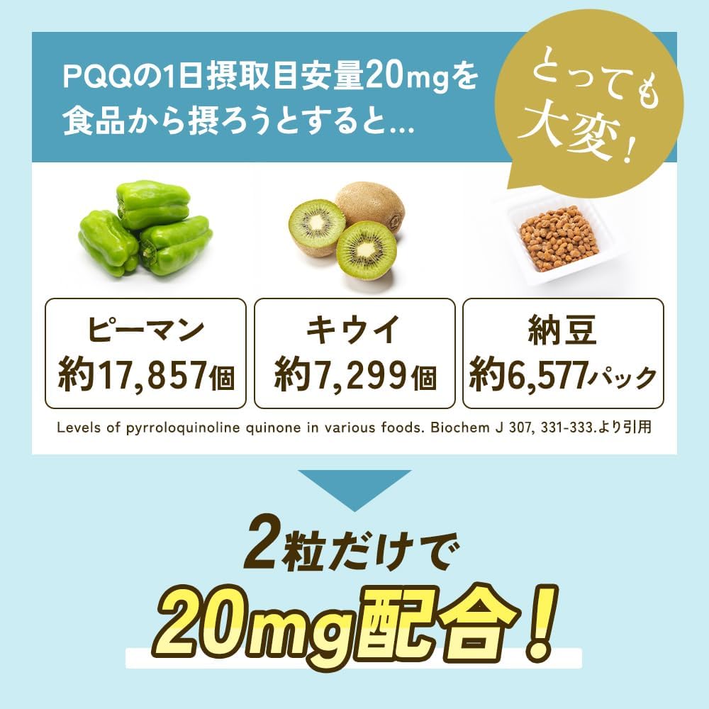 - 【PQQの1日推奨量20mg配合】本品は“見せかけ配合”ではなく、PQQ(ピロロキノリンキノン) 20mg を配合し、実用量重視しながら、原料成分の数を増やしすぎず、主成分の配合量と質を優先しています。