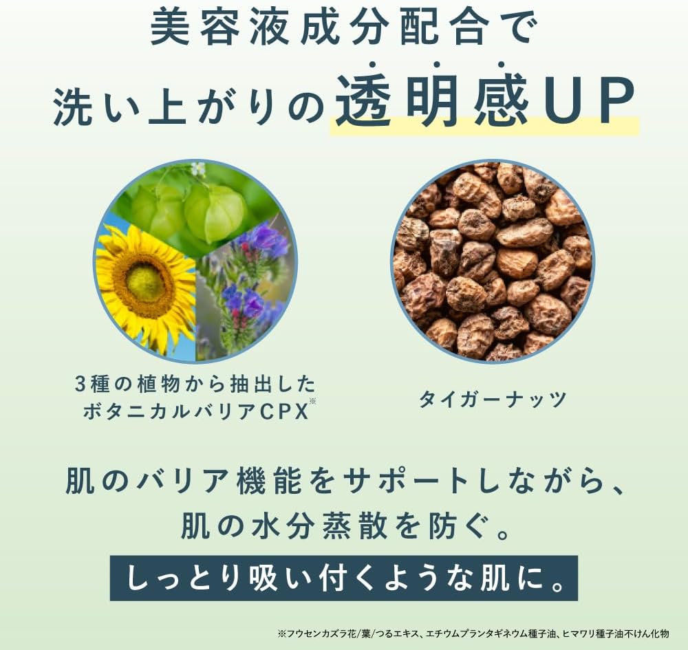 - ≪ POINT3 ≫ トリートメント機能で洗いあがりもちもち、透明感UP。3種の植物から抽出したボタニカルバリアCPX※3とスーパーフードとして注⽬されているタイガーナッツによって肌のバリア機能をサポートしながら、肌の⽔分蒸散を防ぐ。洗いあがりはしっとりとした吸い付くような肌に。 ※3 フウセンカズラ花/葉/つるエキス、エチウムプランタギネウム種⼦油、ヒマワリ種⼦油不けん化物