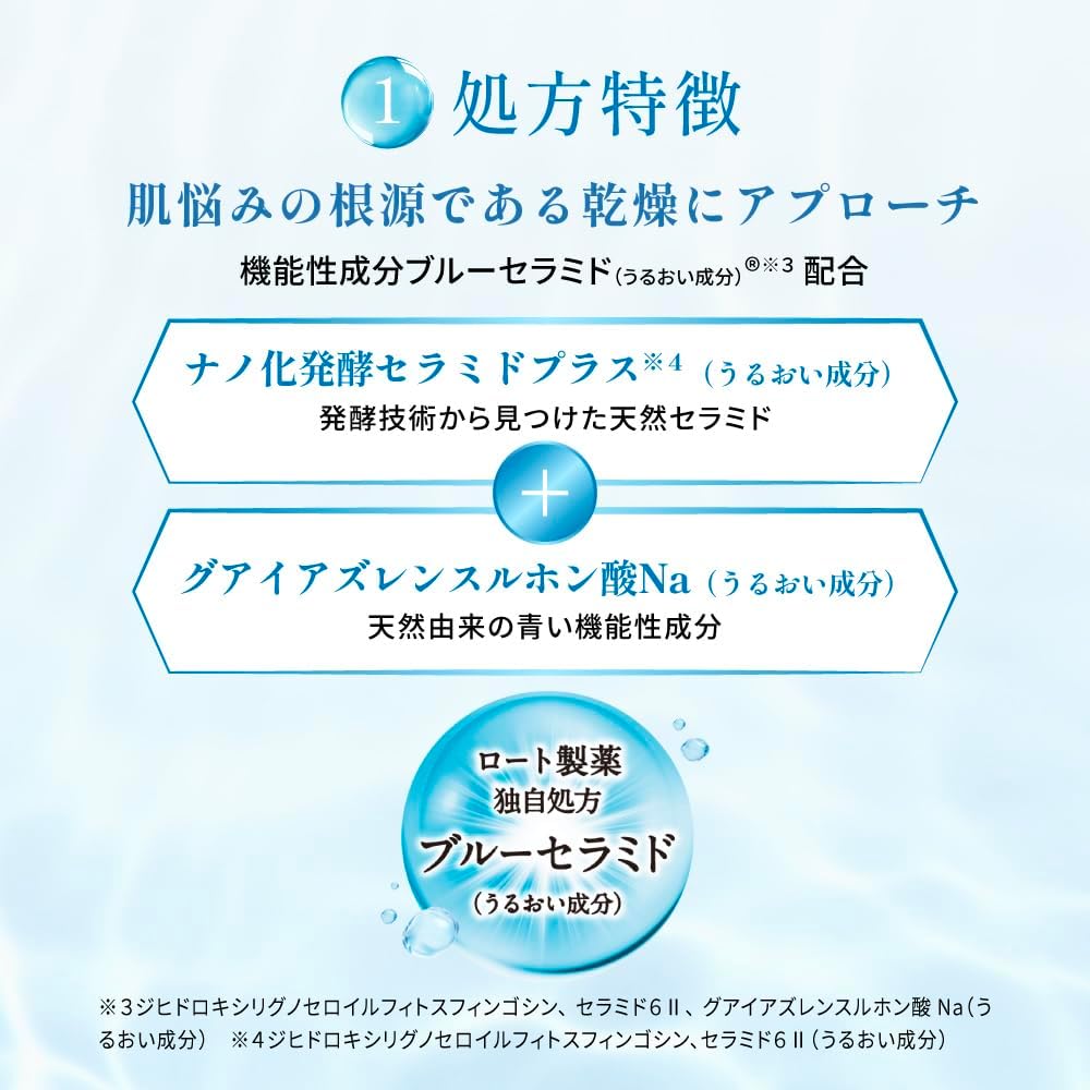 - ◆機能性成分ブルーセラミドとは? 発酵技術から見つけた天然セラミド「ナノ化発酵セラミドプラス(うるおい成分)」+天然由来の青い機能性成分「グアイアズレンスルホン酸Na(うるおい成分)」⇒ロート製薬独自処方「ブルーセラミド(うるおい成分)」