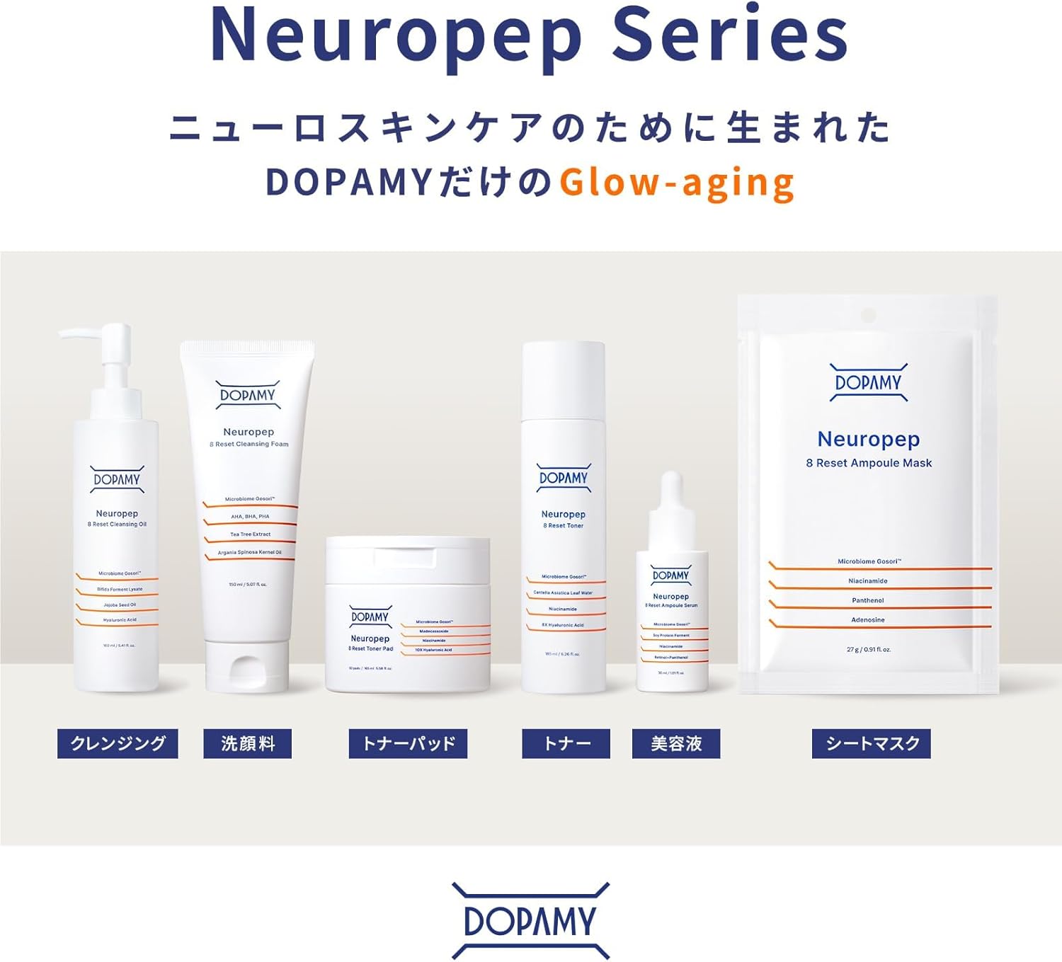 DOPAMY ニューロペップ 8R クレンジングオイル 160ml DOPAMY ニューロペップ8Rクレンジングフォーム 150ml 洗顔フォーム 泡 弱酸性 AHA BHA PHA DOPAMY ニューロペップ8Rトナー 185ml 化粧水 ナイアシンアミド レチノール ゴソリ 発酵 DOPAMY ニューロペップ8Rアンプルセラム 30ml 美容液 ナイアシンアミド レチノール マルチビタミン ヒアルロン酸 DOPAMY ニューロペップ8Rトナーパッド DOPAMY ニューロペップ8Rアンプルマスク 5枚入り カスタマーレビュー 5つ星のうち4.6 134 5つ星のうち4.6 41 5つ星のうち4.8 86 5つ星のうち4.8 138 5つ星のうち4.7 79 5つ星のうち4.6 36 価格 ¥2,368¥2,368 ¥2,368¥2,368 ¥2,368¥2,368 ¥2,812¥2,812 ¥2,368¥2,368 ¥2,368¥2,368 製品タイプ クレンジング 洗顔料&洗顔パック 化粧水 美容液 トナーパッド シートマスク 内容量 160ml(約1ヶ月分) 150ml(約1ヶ月分) 185ml(約1ヶ月分) 30ml(約1ヶ月分) 165ml/60枚入り 27g/5枚入り 特徴 とろけて落ちる ディープオイルクレンジング 水光肌に導く弱酸性洗顔フォーム 多機能ビタミン配合の化粧水 まるでガラスのように澄んだ肌へ導く美容液 忙しい毎日でも、貼るだけで簡単ケアパッド 超密着マスクで集中ケア 香り フローラル&ムスク フローラル&ムスク フローラル&ムスク フローラル&ムスク フローラル&ムスク フローラル&ムスク 使用感 しっとり&なめらか すっきり&なめらか しっとり&みずみずしい しっとり&ハリツヤ しっとり&すこやか ふっくら&すべらか
